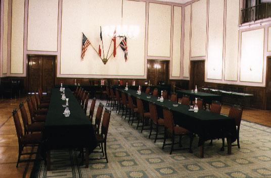 The hall in which the capitulation was signed had been the dining room of a former officers' clubhouse. For the official opening of the Capitulation Museum in 1967 the room was restored exactly as it had been. And it retains its original appearance today, with the exception of the wall-charts, mounted in 1967, listing the units that participated in the capture of Berlin. Positioned in the room for the surrender, mute witnesses, so to speak, were the lighting on the ceiling and the walls as well as the flags of the four Allied Powers by the front wall. The furniture and furnishings were reconstructed. A documentary film chronicle of the events in Karlshorst on May the 8th - 9th is projected onto a large screening area in the room. |