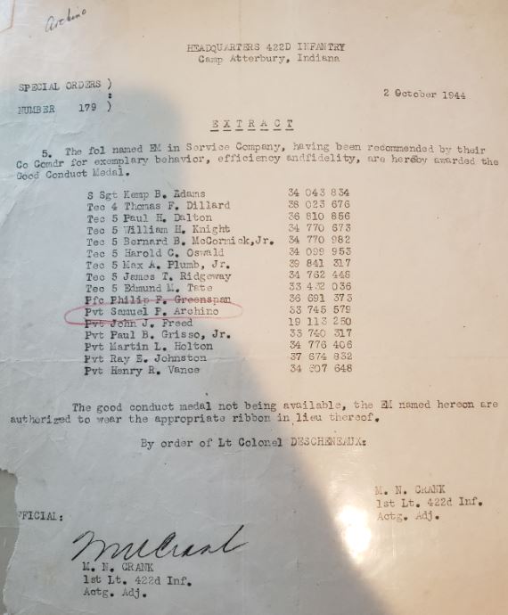 Source: Justin Wallace - papers of his Grandfather Pvt Samuel P. Archino 422/F. 02/14/2021