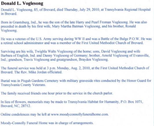 Donald Voglesong was in a German P.O.W. camp (prisoner of war) during