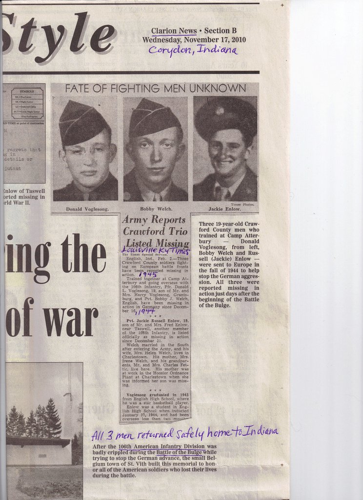 during the Battle of the Bulge of WWII. CPL Voglesong, along with two of