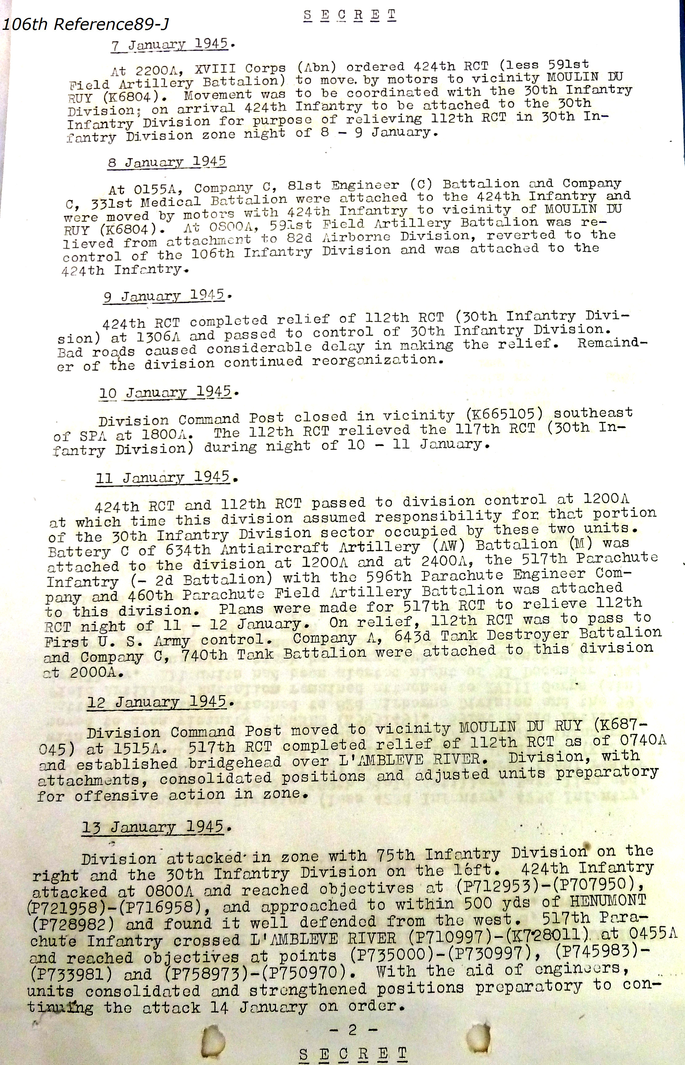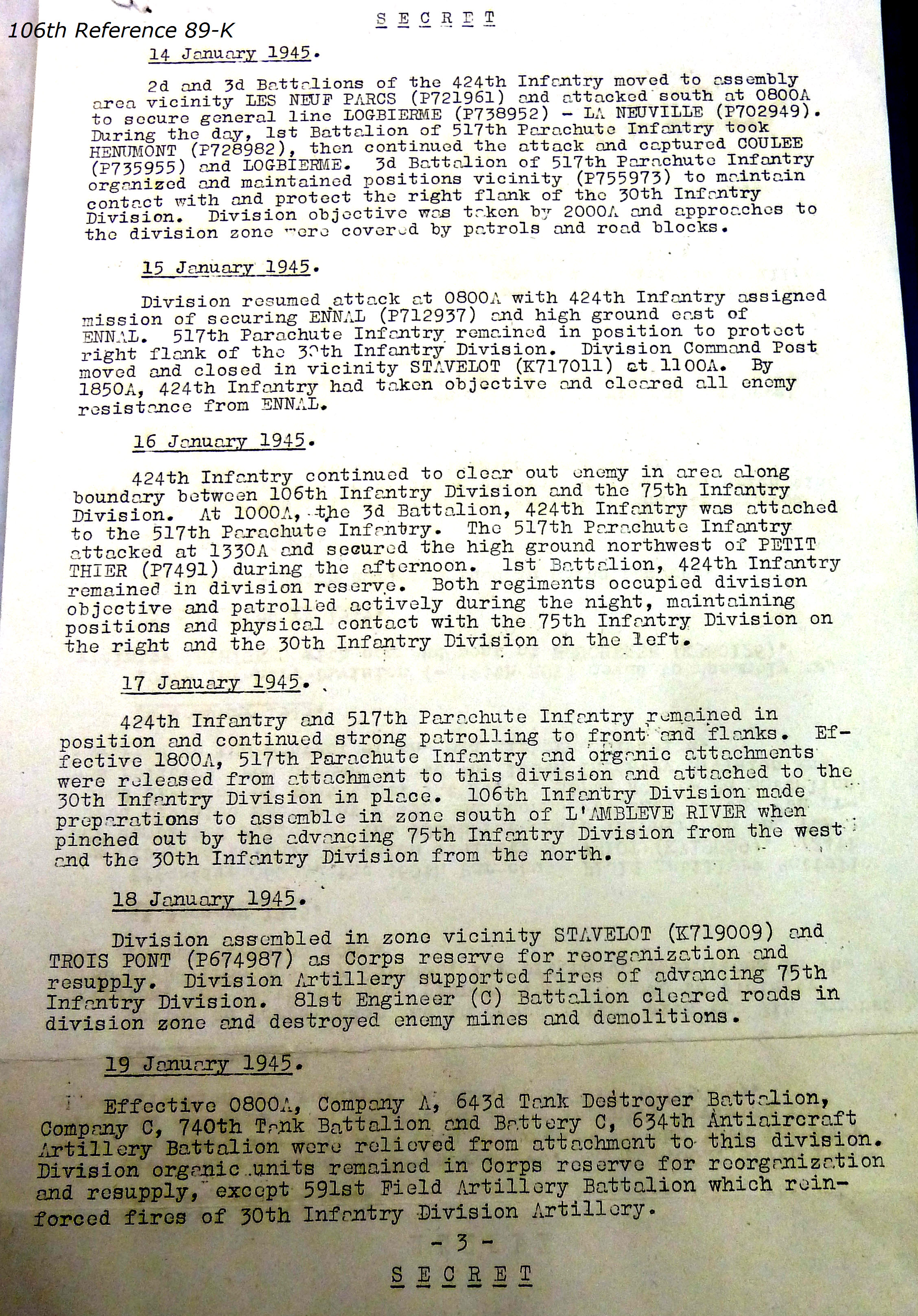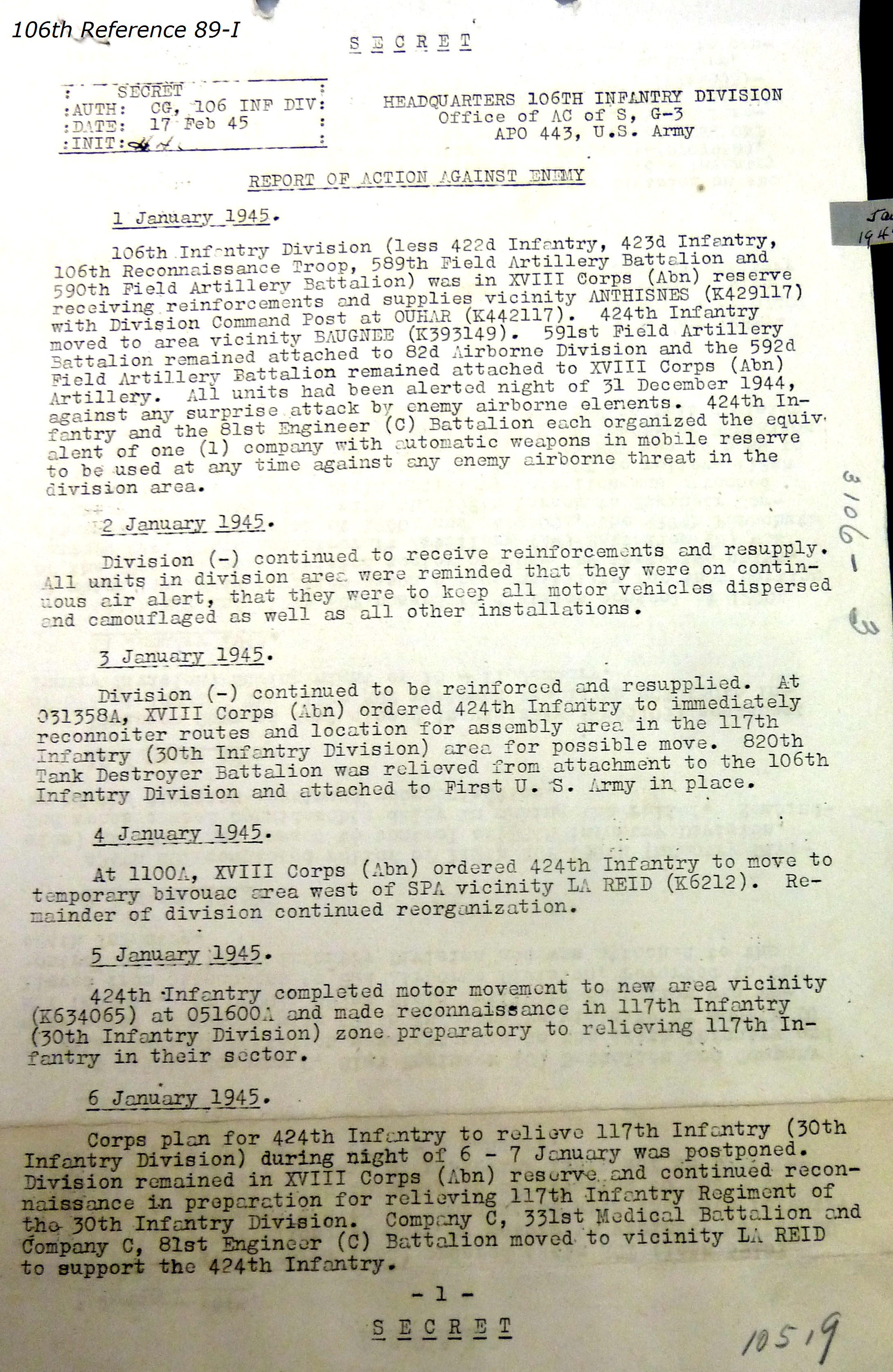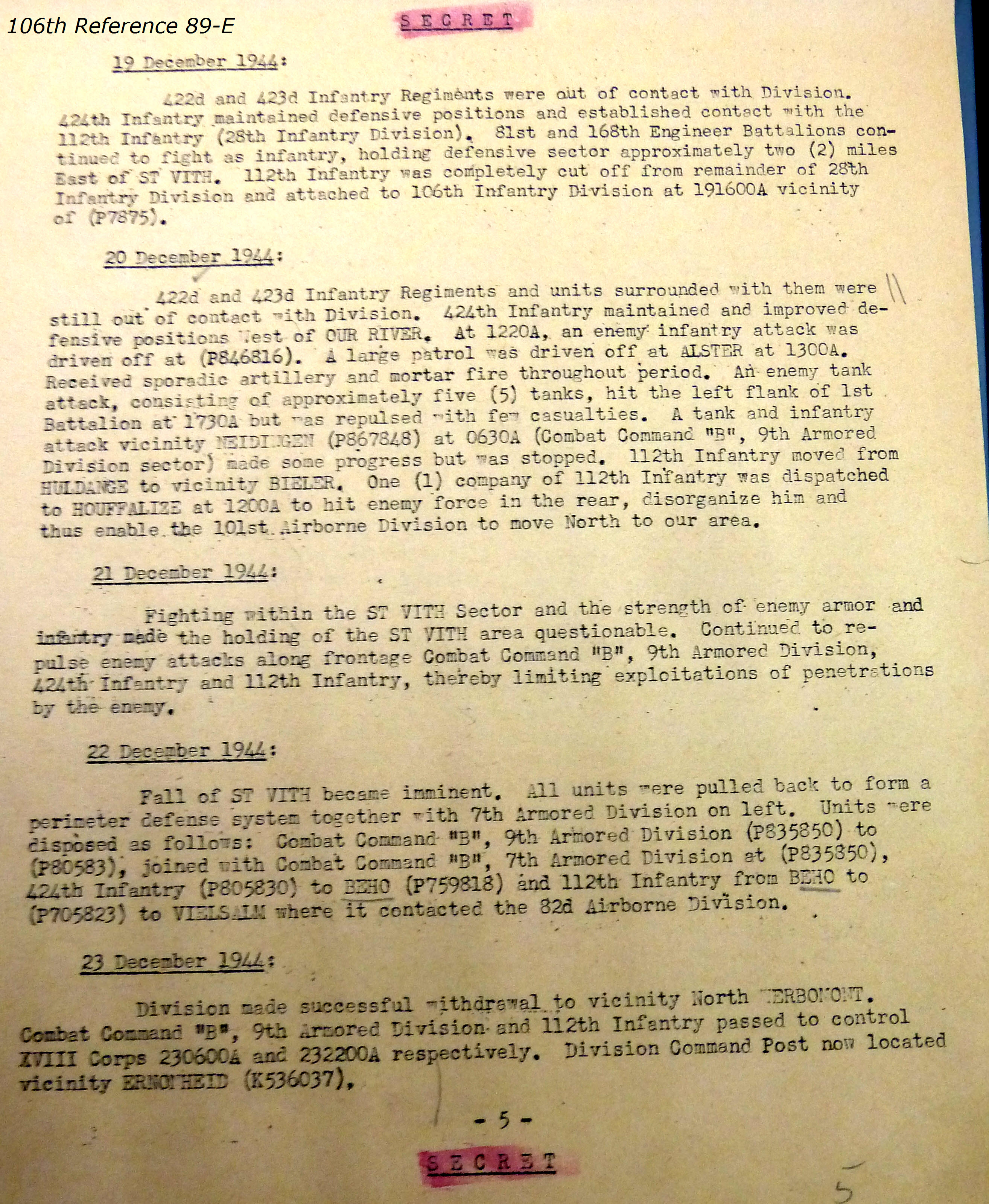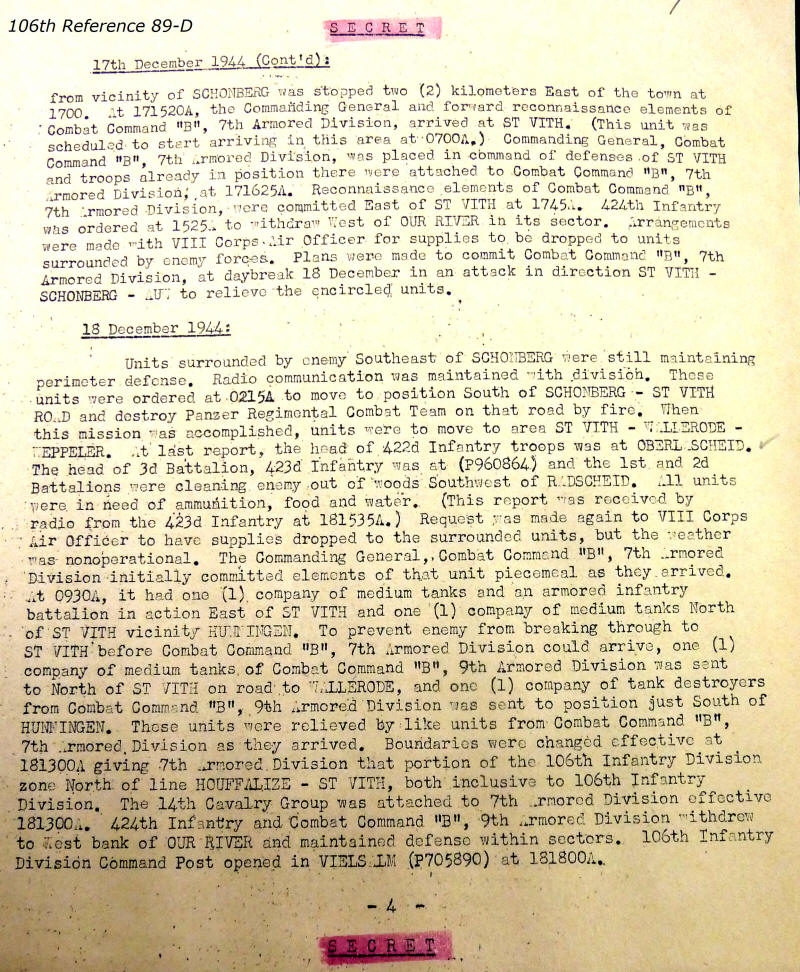 106th Division Reference 89 Reports of Action Against Enemy 12/1944 to 01/1945