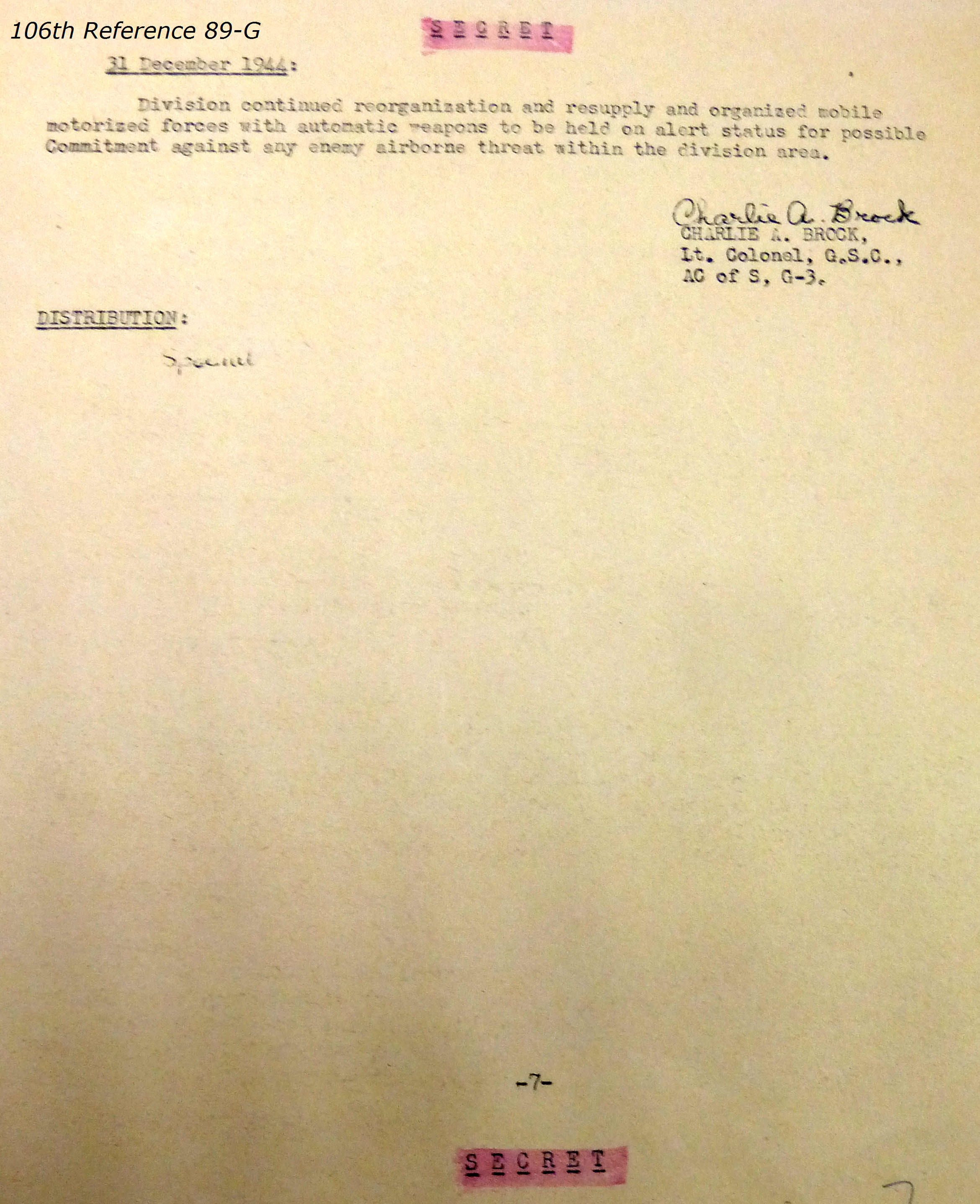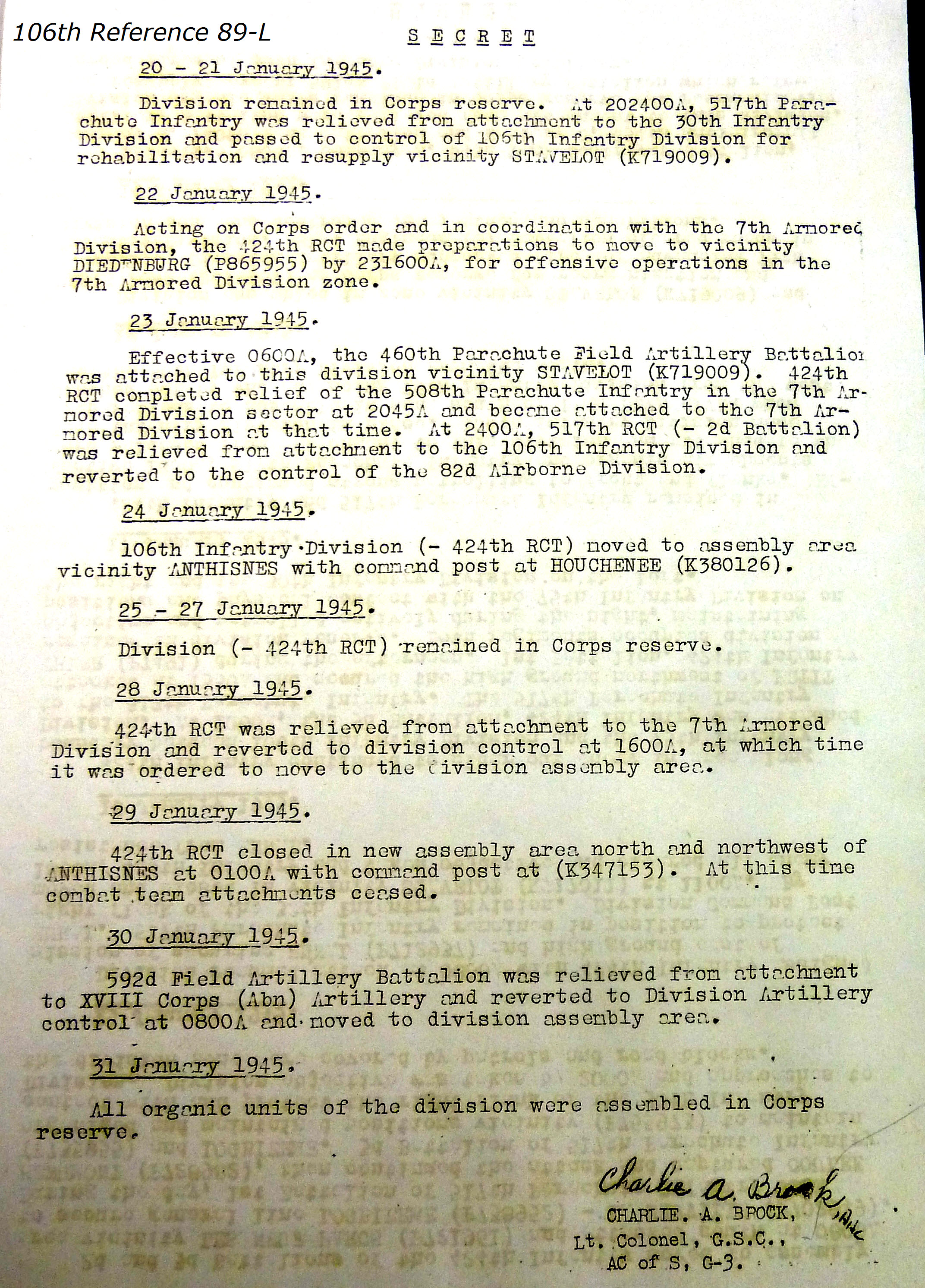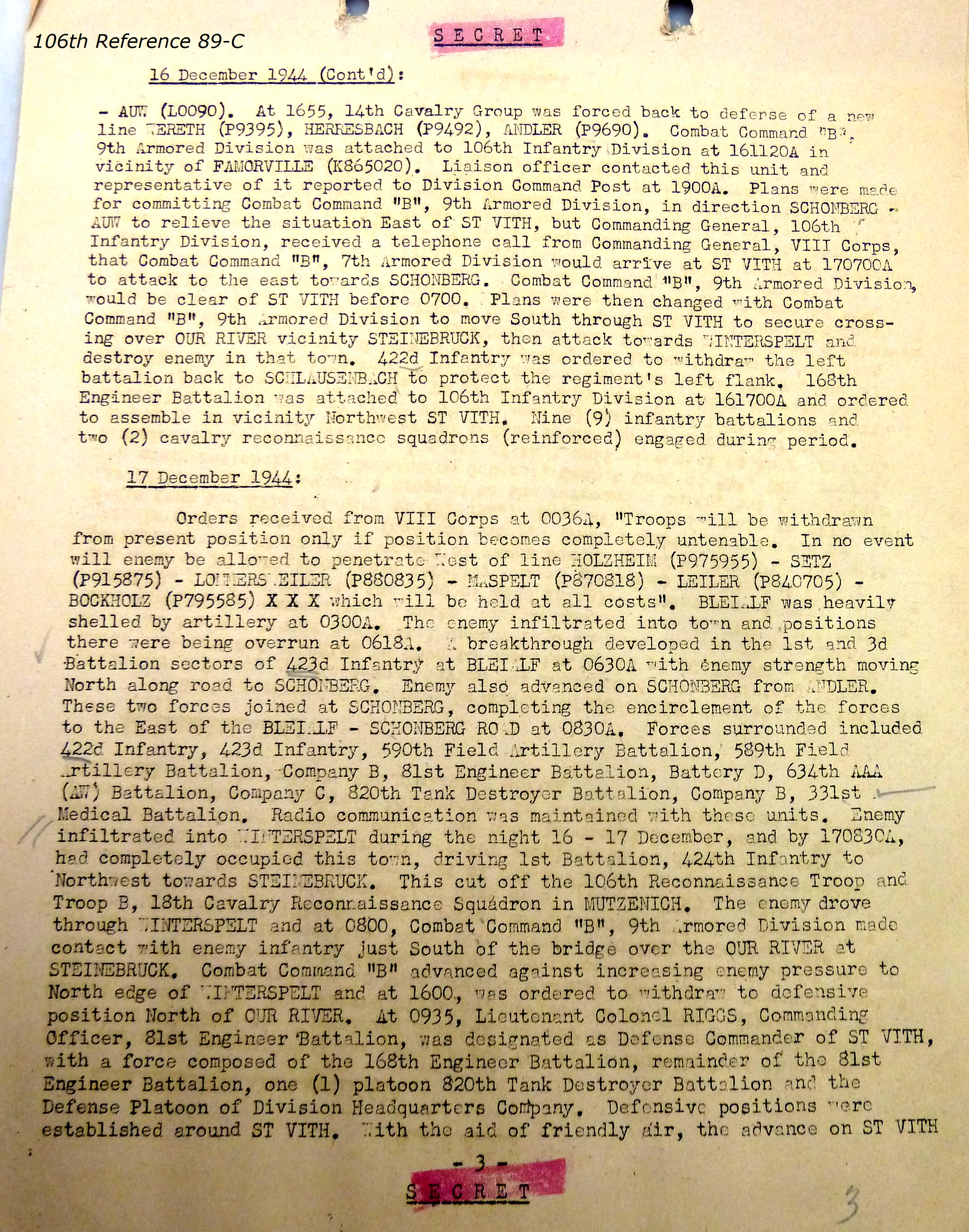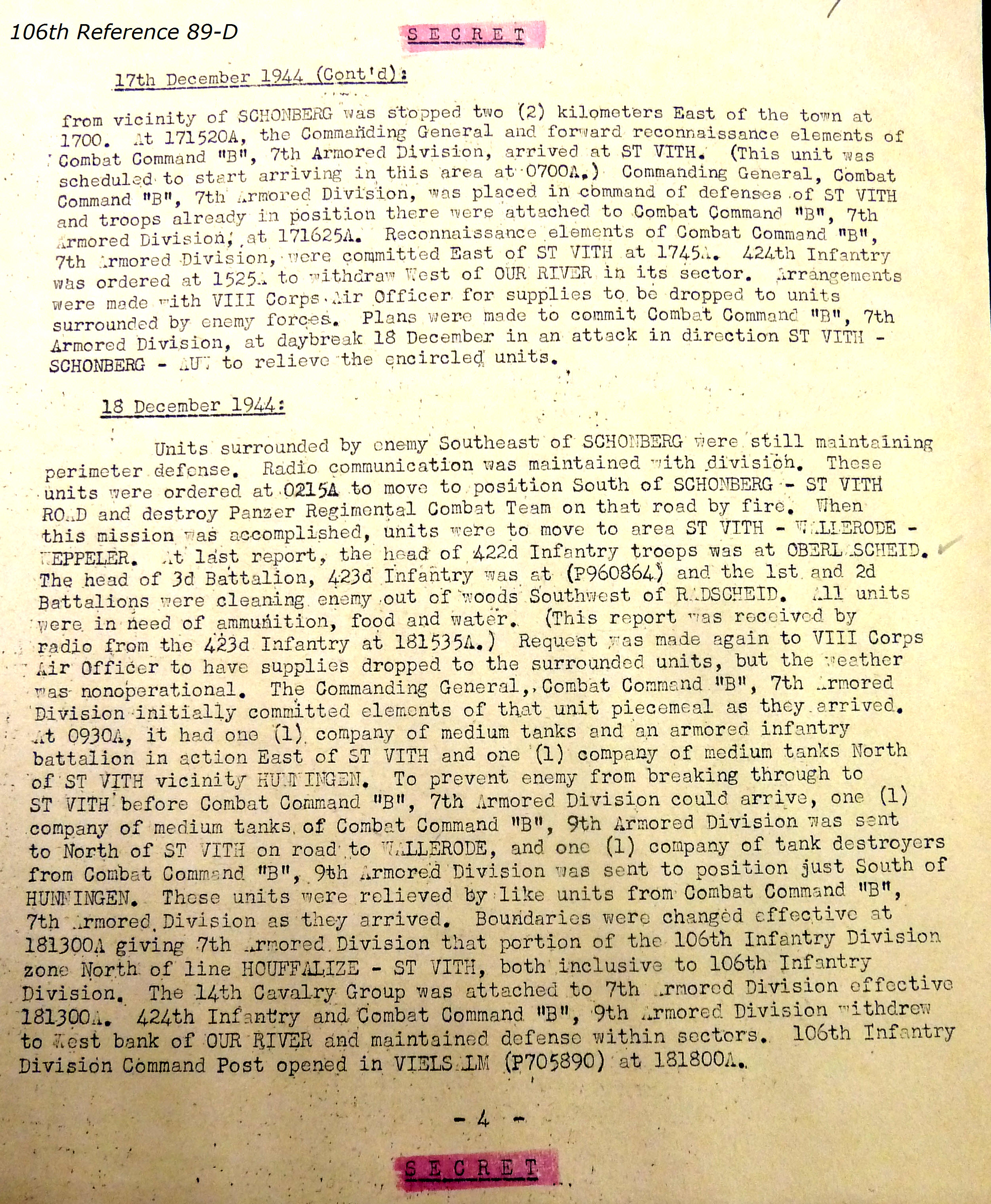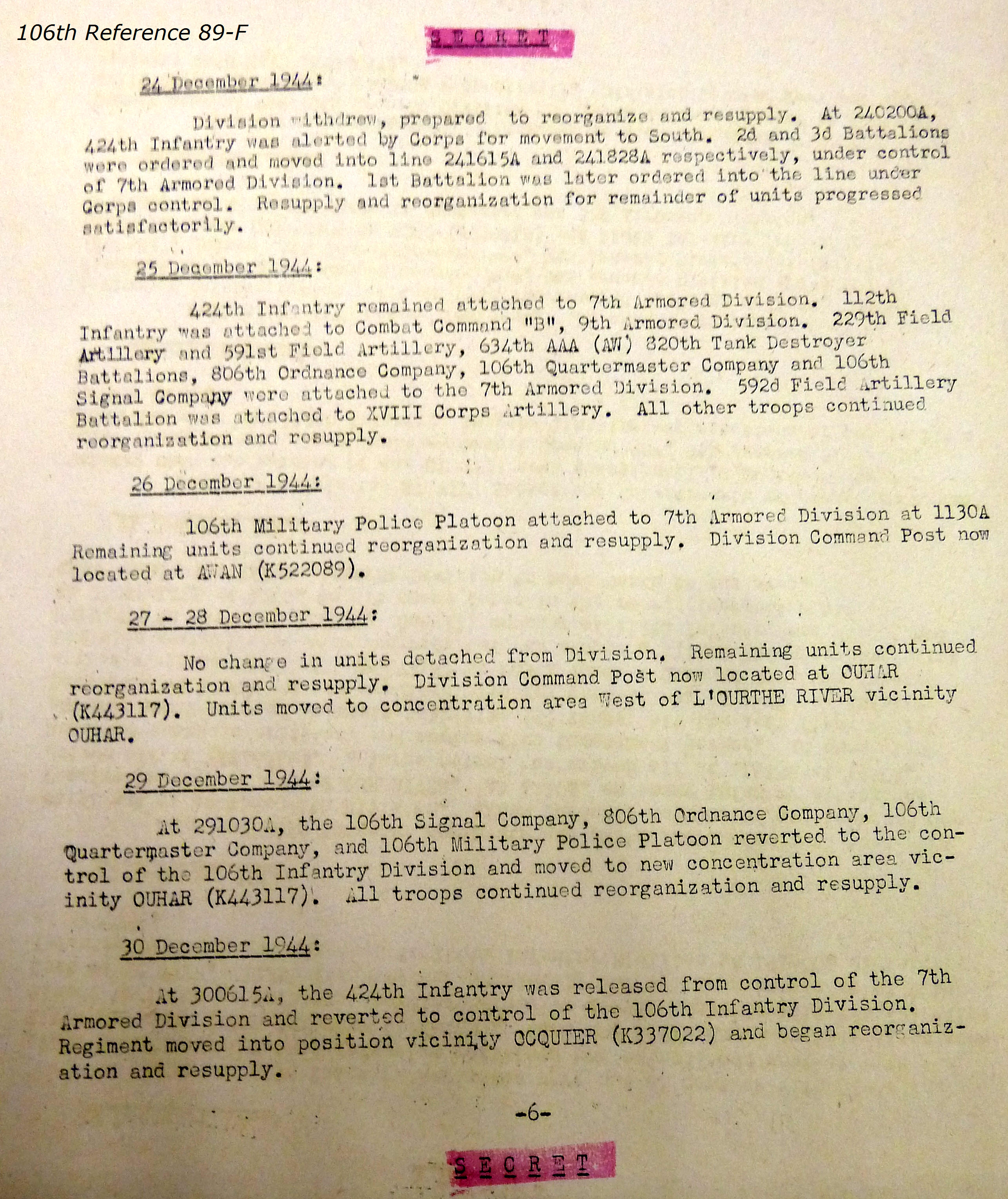 106th Division Reference 89 Reports of Action Against Enemy 12/1944 to 01/1945