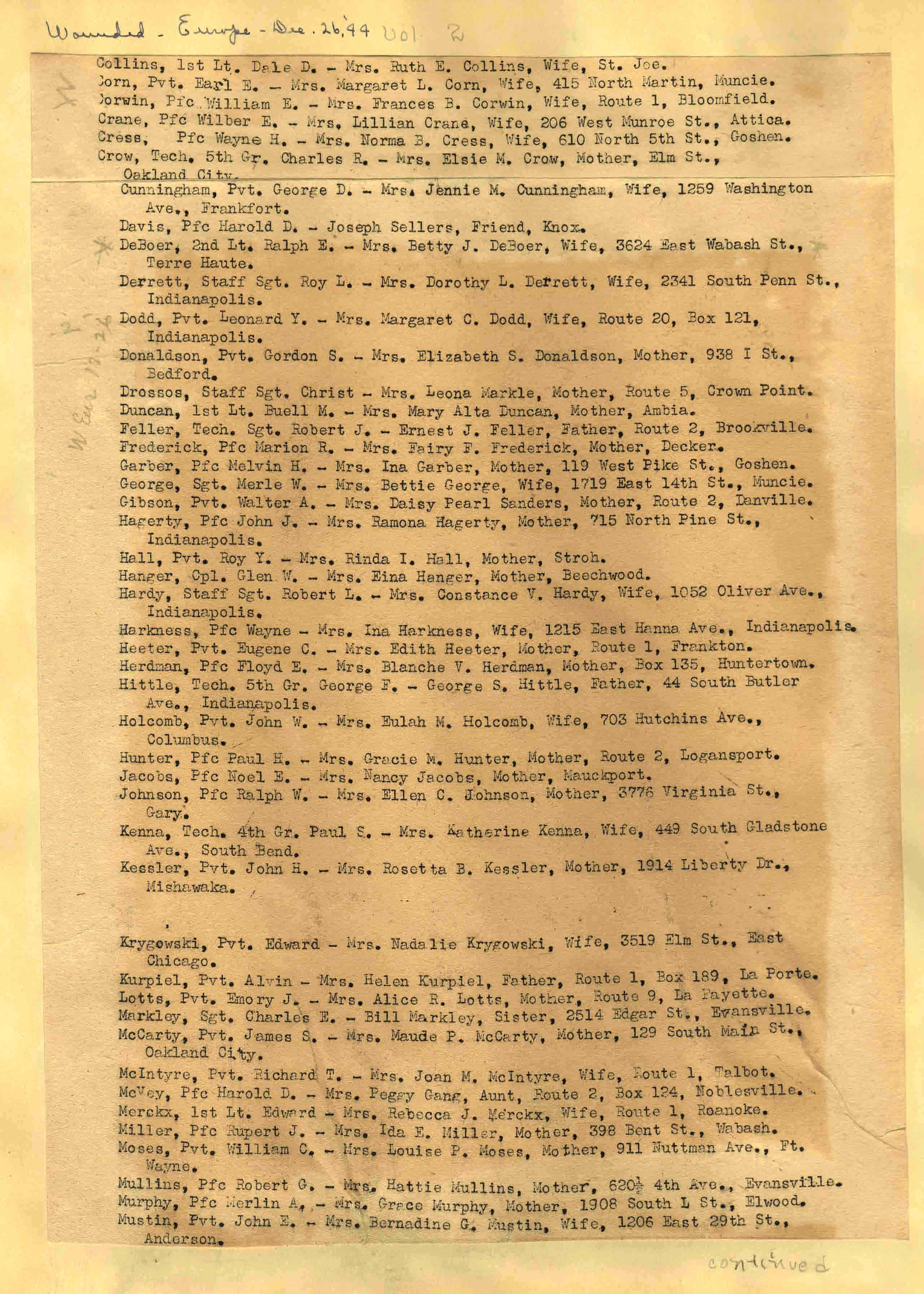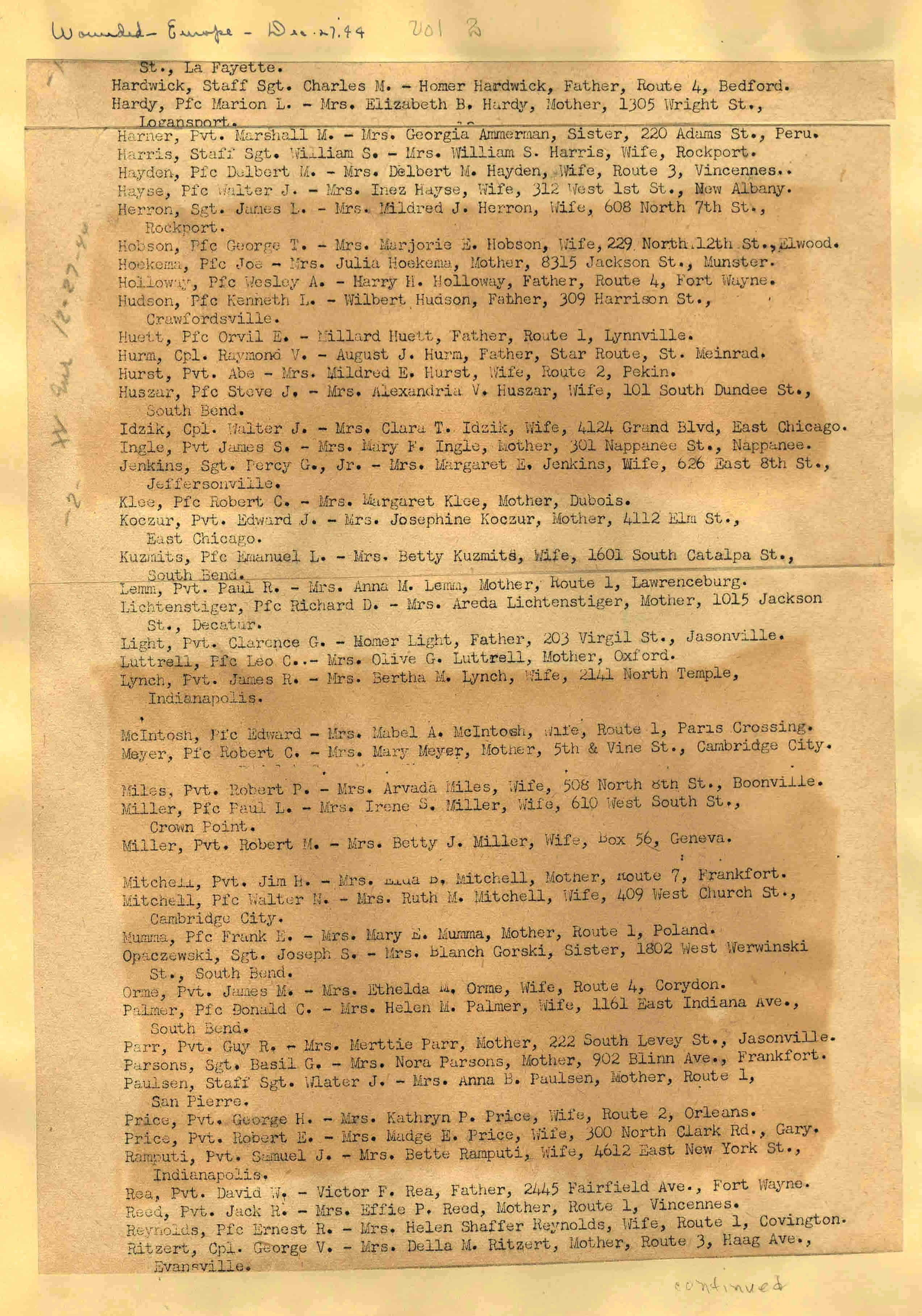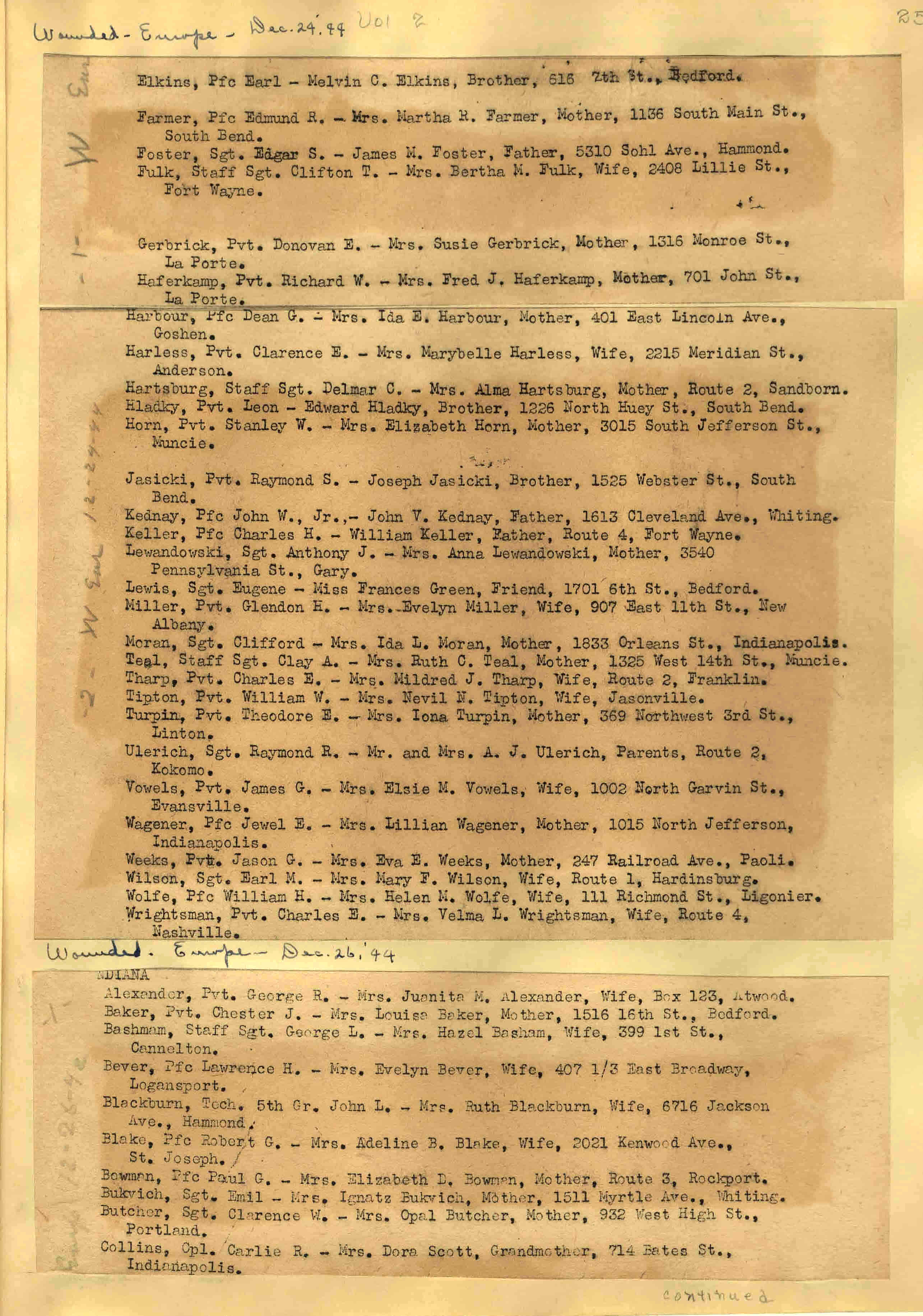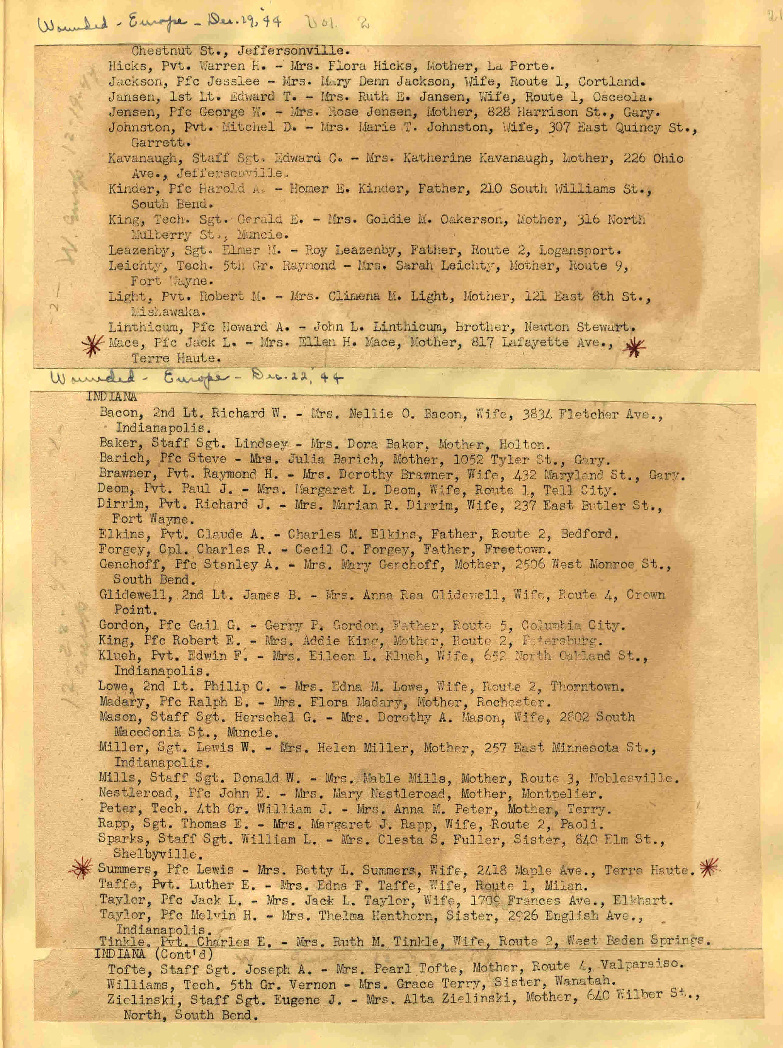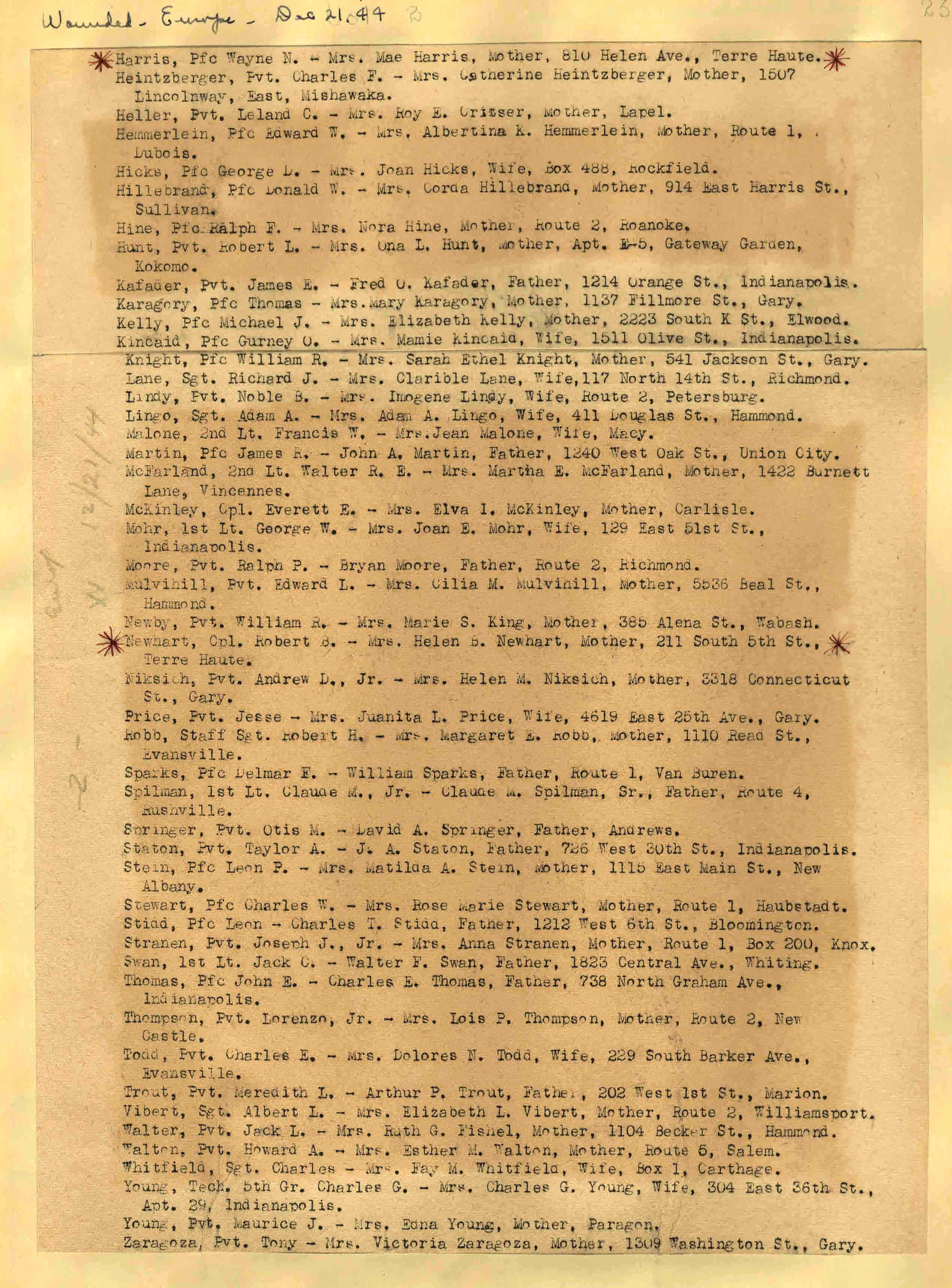 | Wounded - Europe 12/191944 12/22/1944 ![]() page 21 |