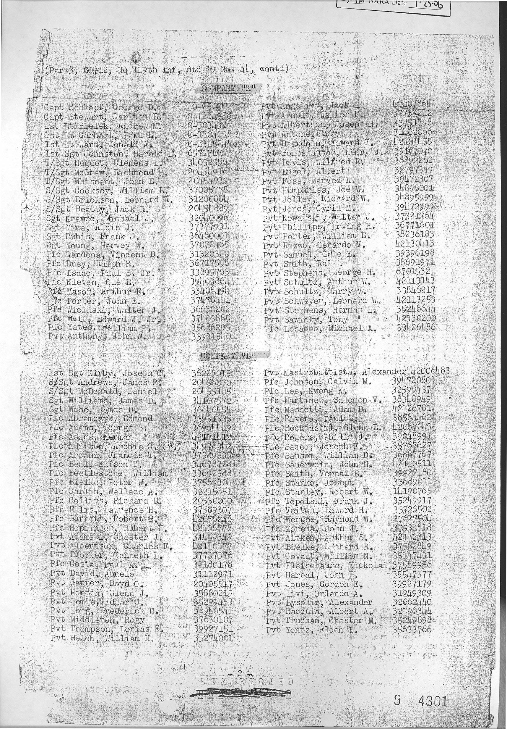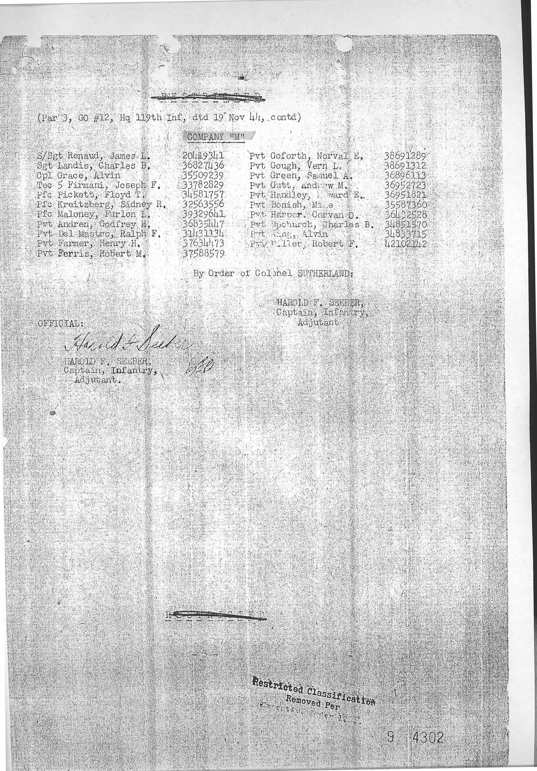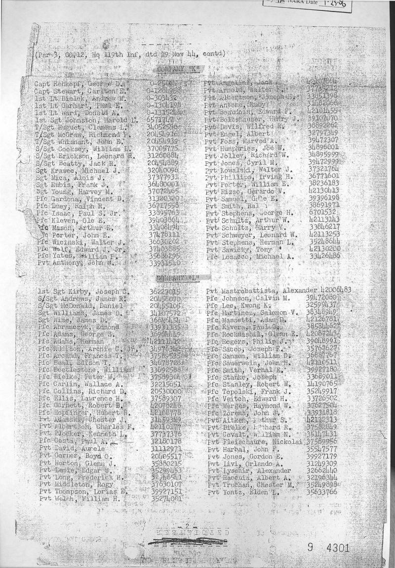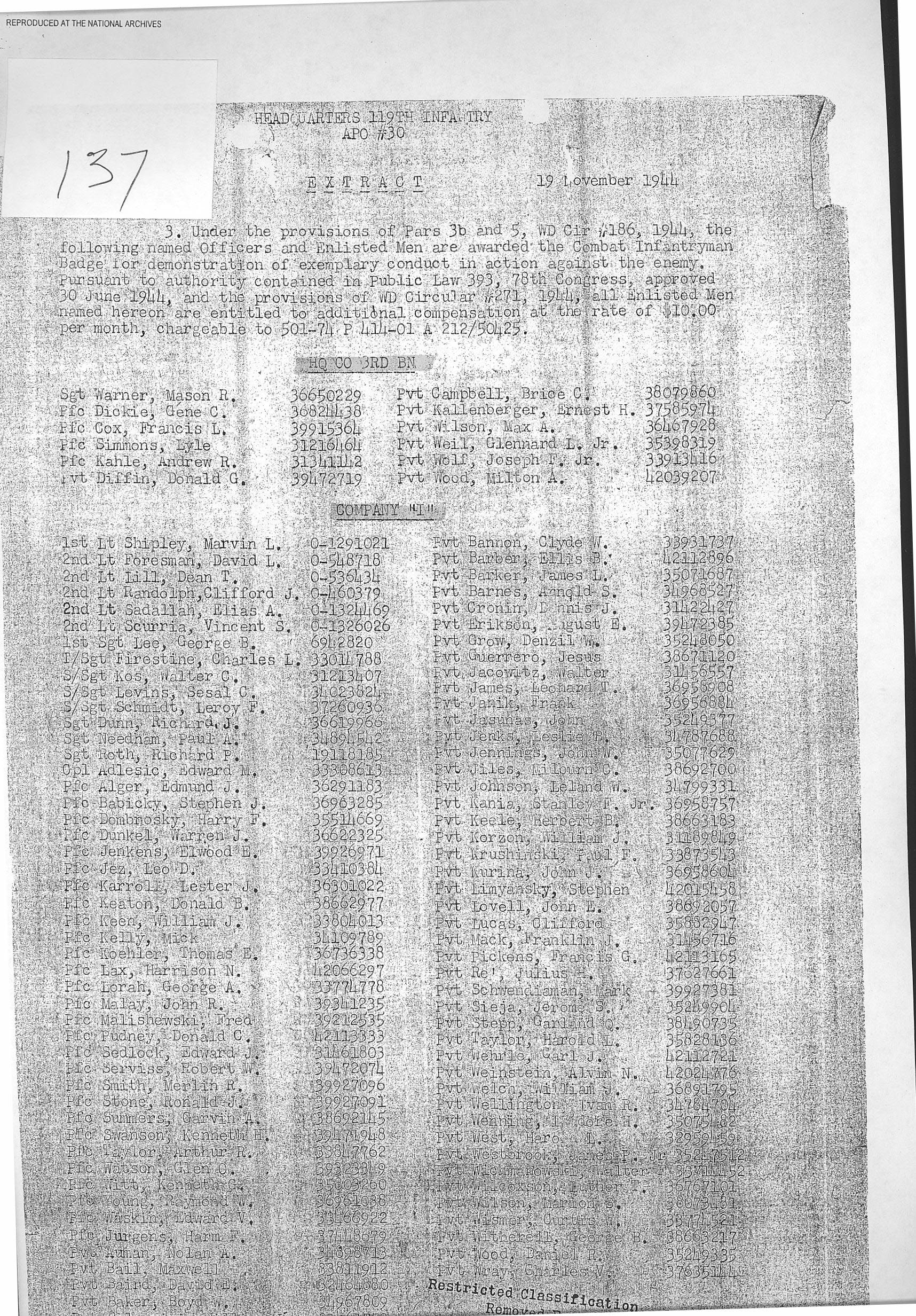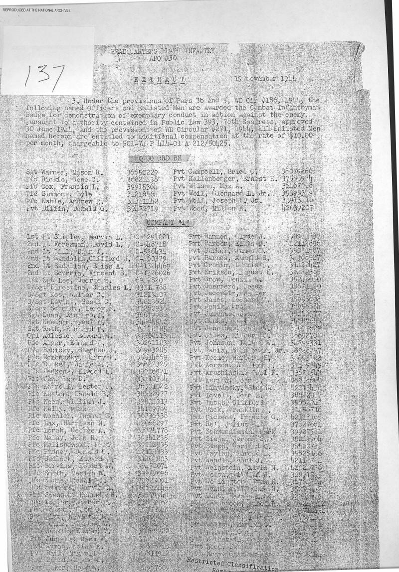 Combat Infantryman's Badge 119/3 BN/HQ CO, 119/I, 119/K, 119/L, 119/M General Order 1944-010-18 07/14/1944 Reference 137