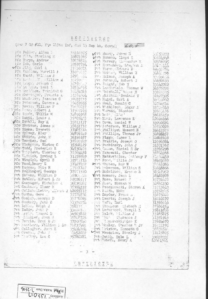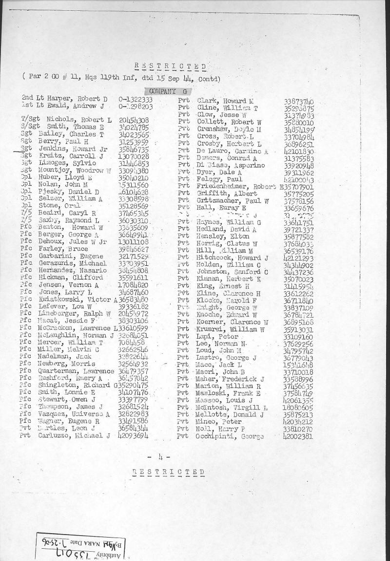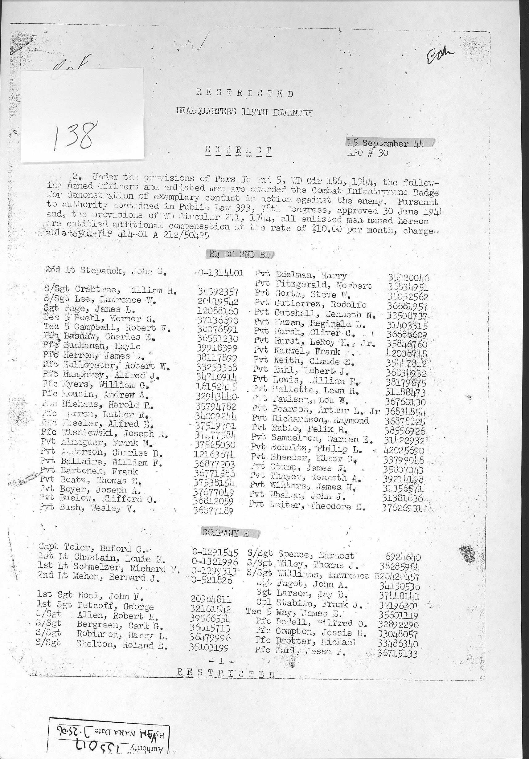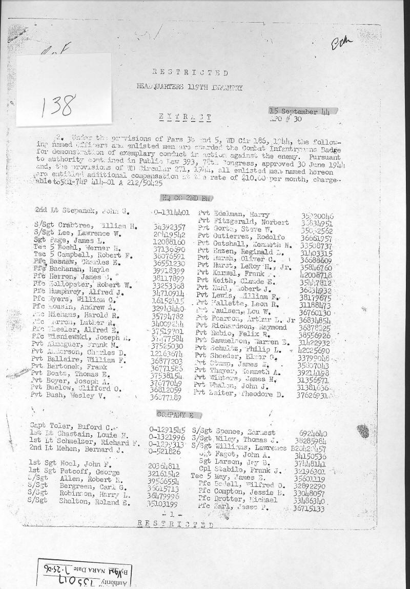 Combat Infantryman's Badge 119/2 BN/HQ CO, 119/E, 119/F, 119/G, 119/H General Order 1944-010-19 07/14/1944 Reference 138