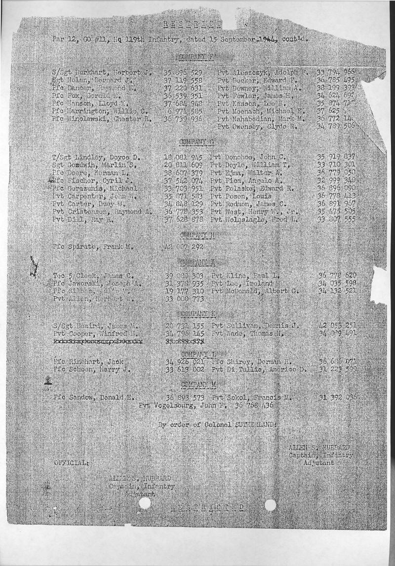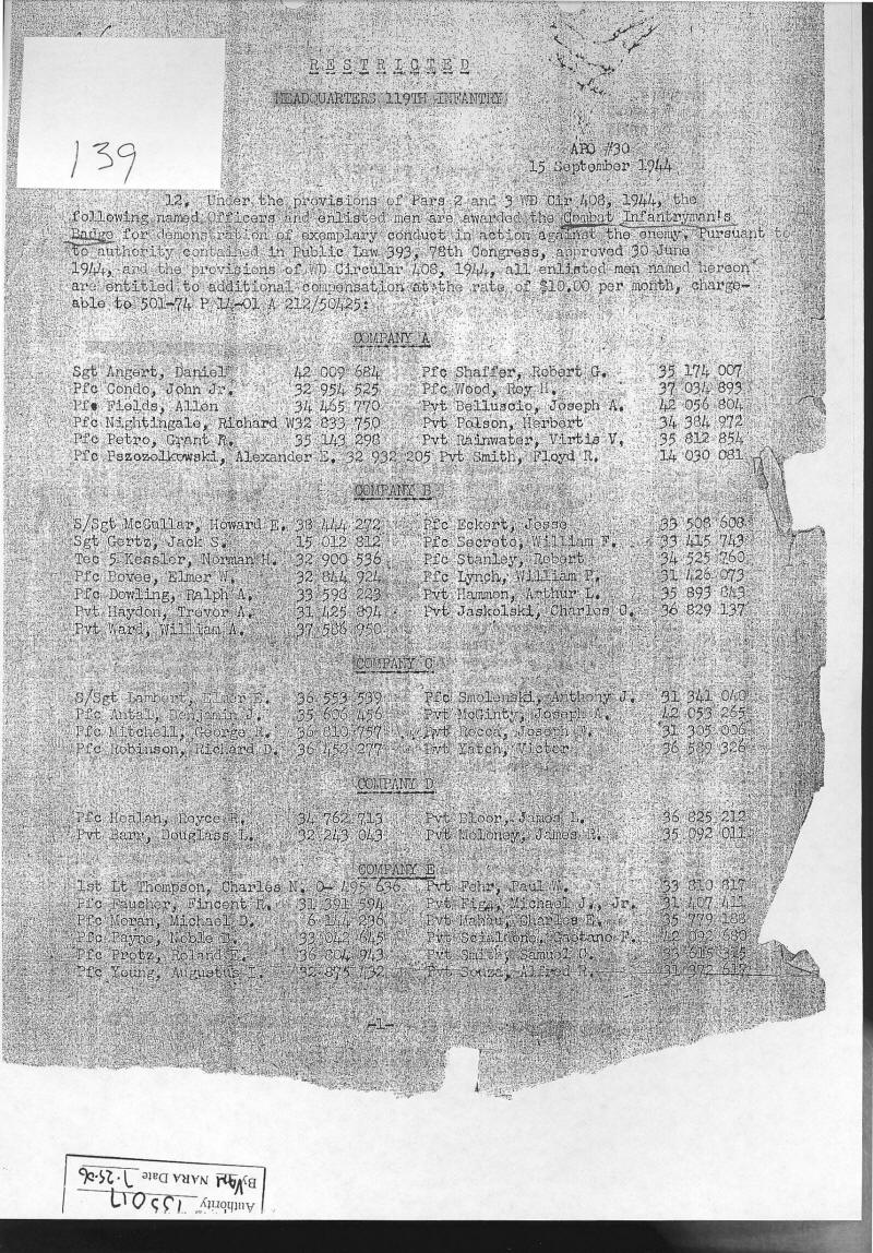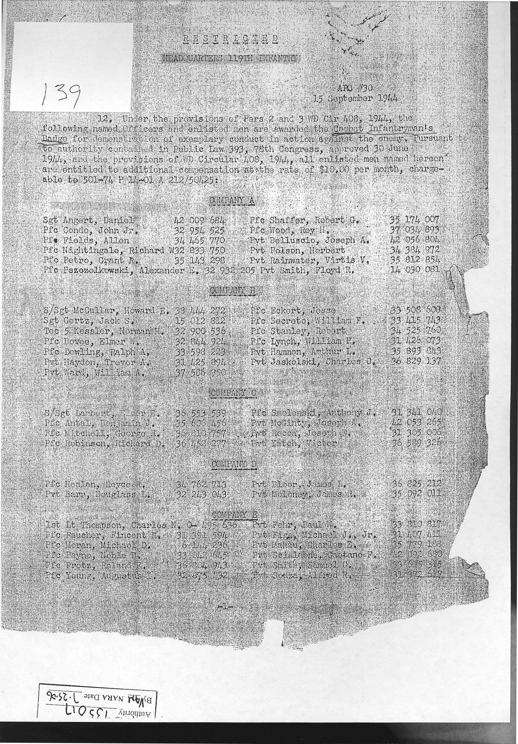 Combat Infantryman's Badge 119/A, 119/B, 119/C, 119/D, 119/e, 119/F, 119/G, 119/H, 119/I, 119/K, 119/M General Order 1944-010-20 07/14/1944 Reference 139