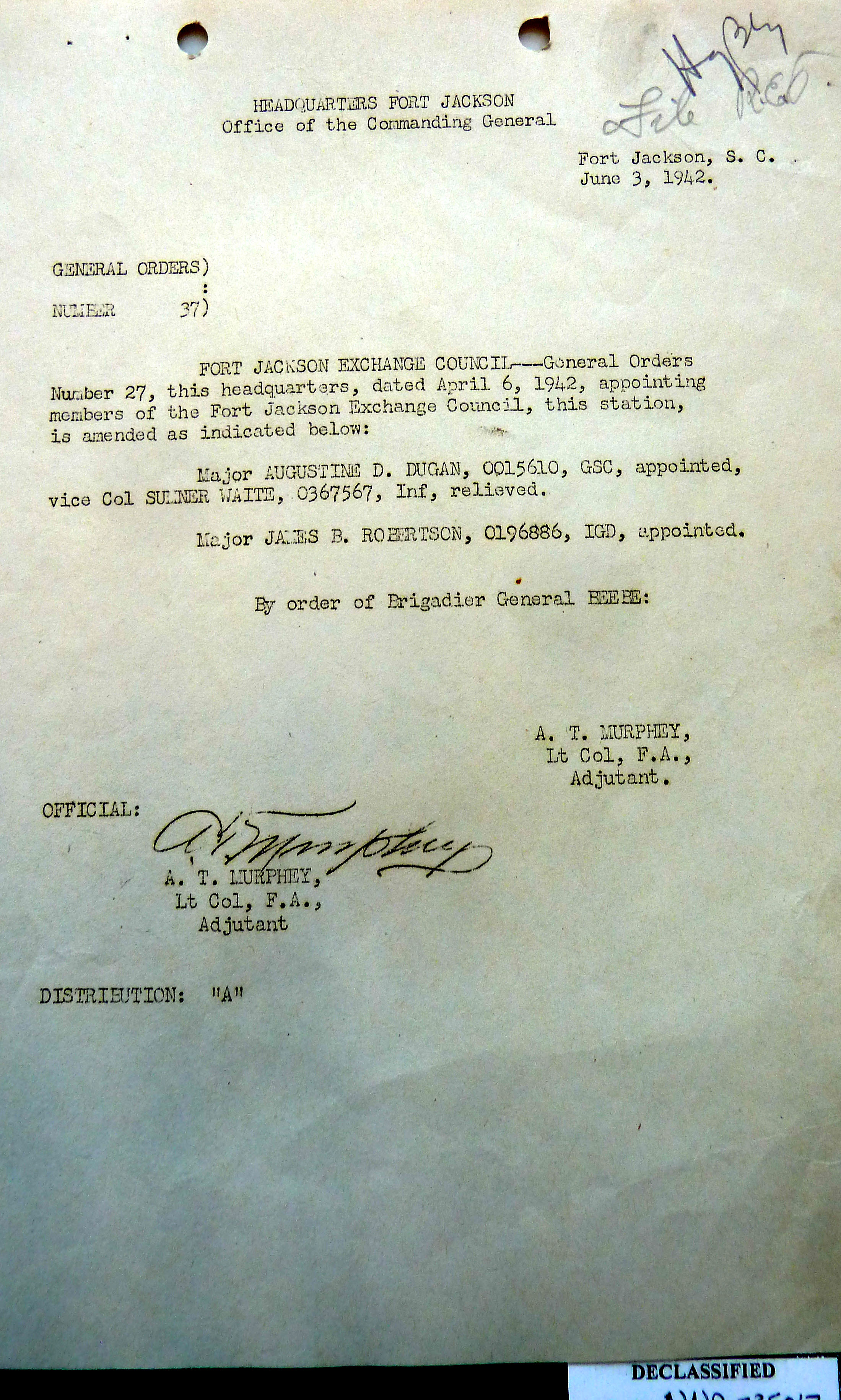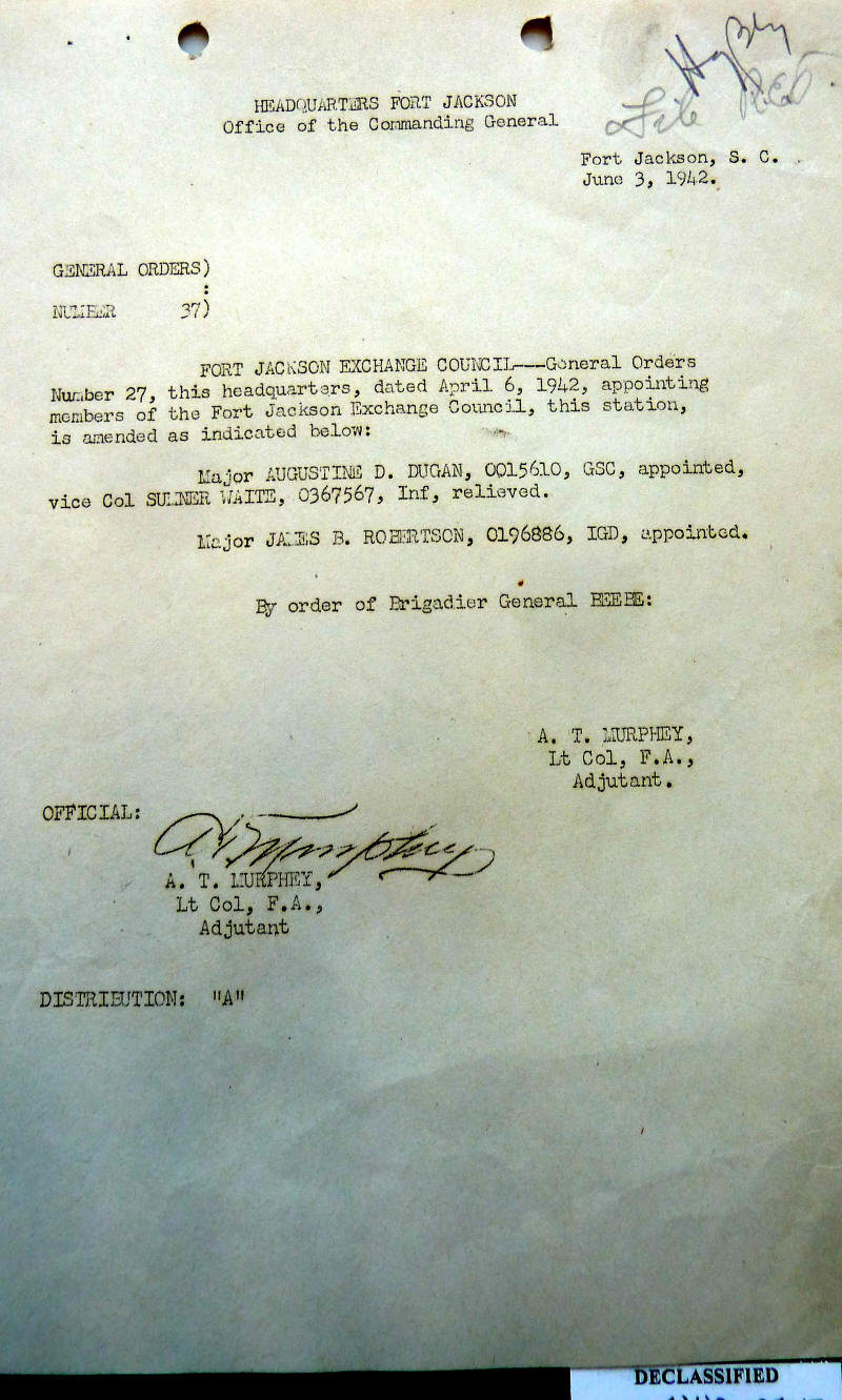 Headquarters Fort Jackson Reference # 192-1942-GO-37-FtJackson General Order 1942-37-FtJackson 06/03/1942