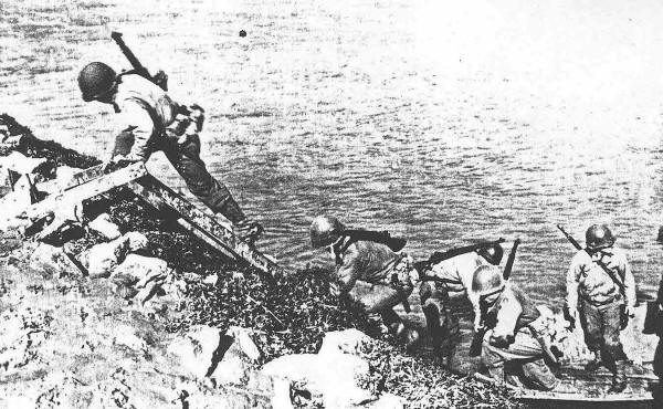 Practice crossing of Vire River, Airel, France, July 1944. |