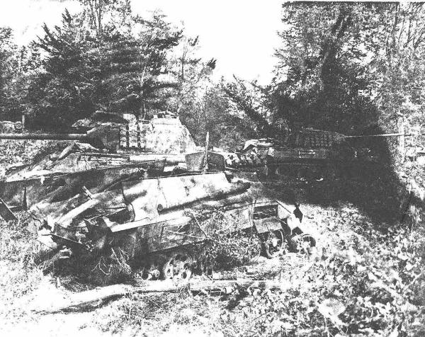 Enemy tanks knocked out at Mortain, France, August 1944. |