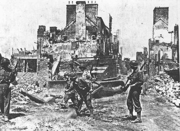 Company F bulldozer clearing streets of rubble at Mortain, France,