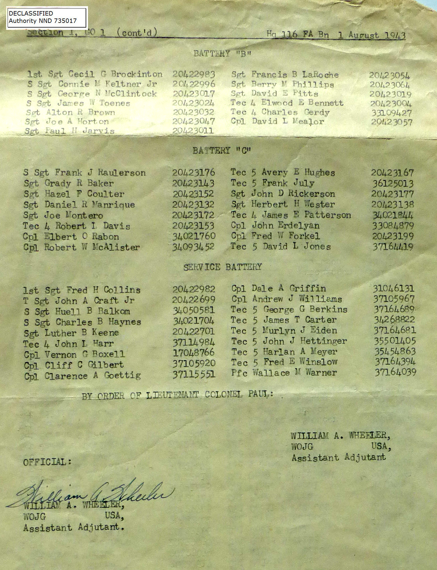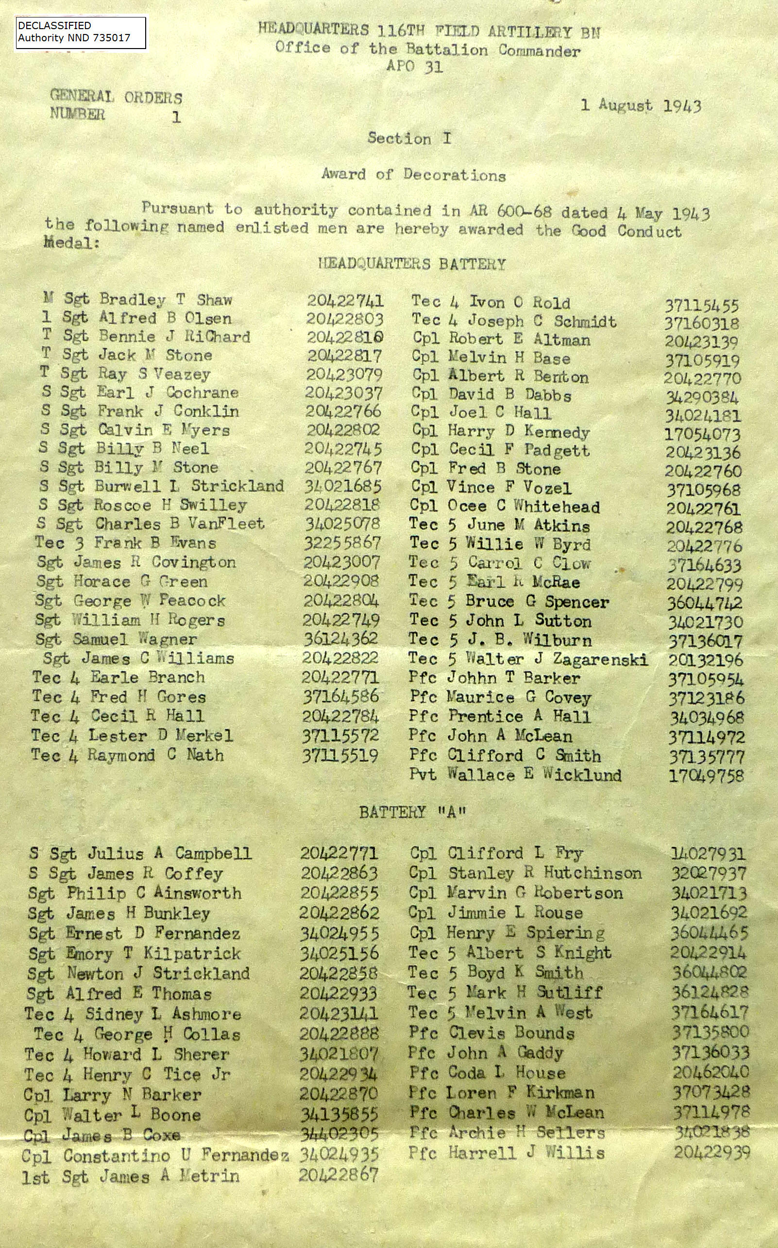 08/01/1943 | Good Conduct Medals, HQ Batt, A Batt, B Batt, C Batt & SVC Batt |