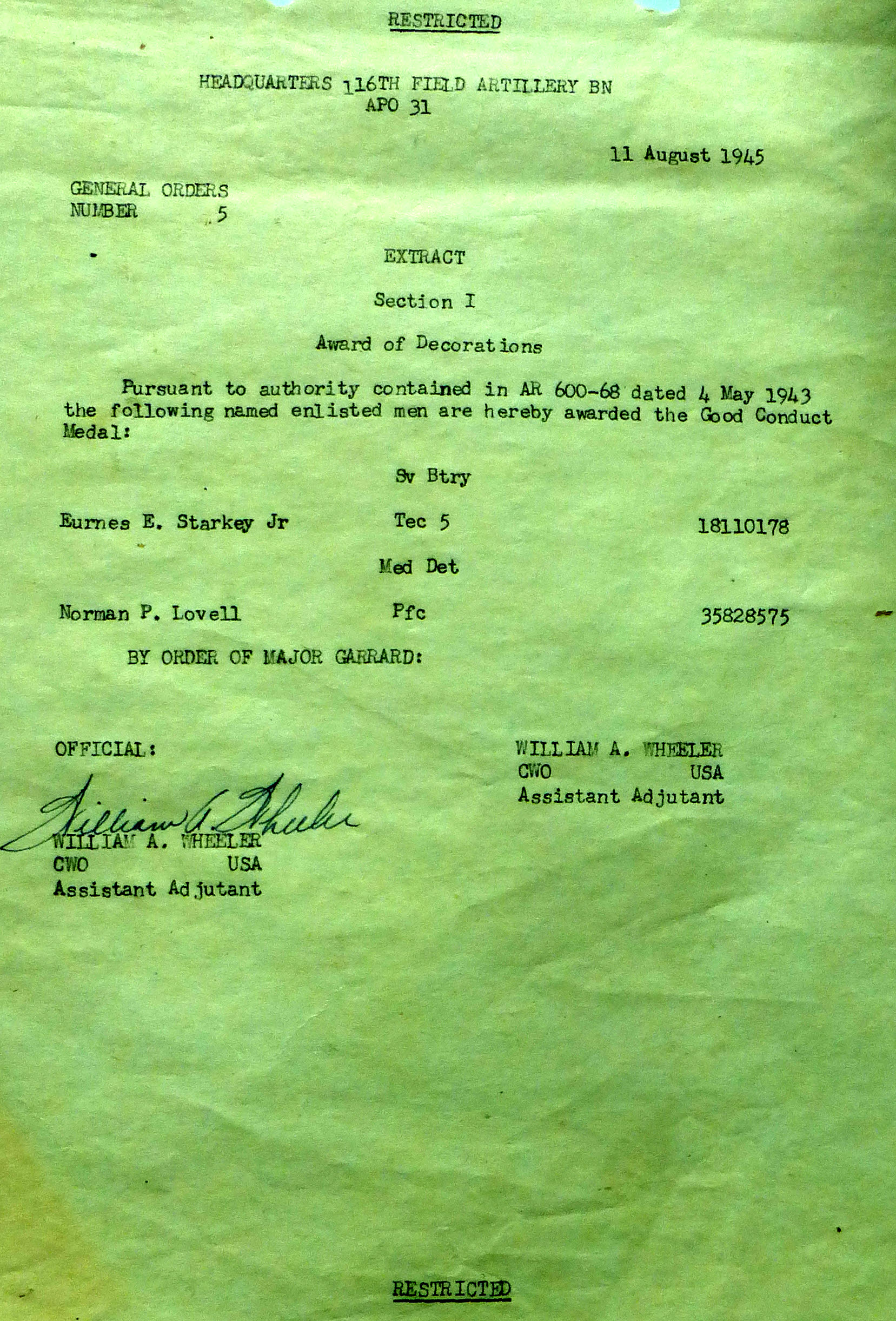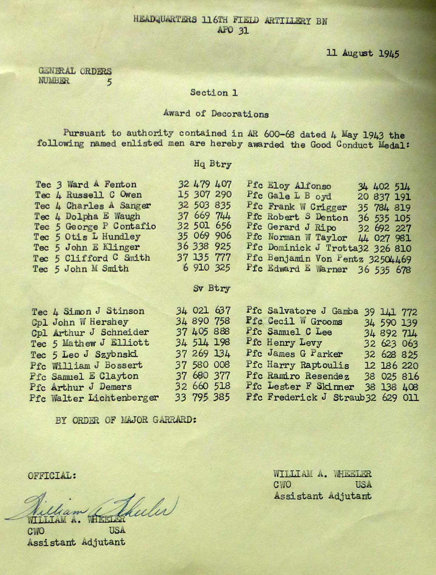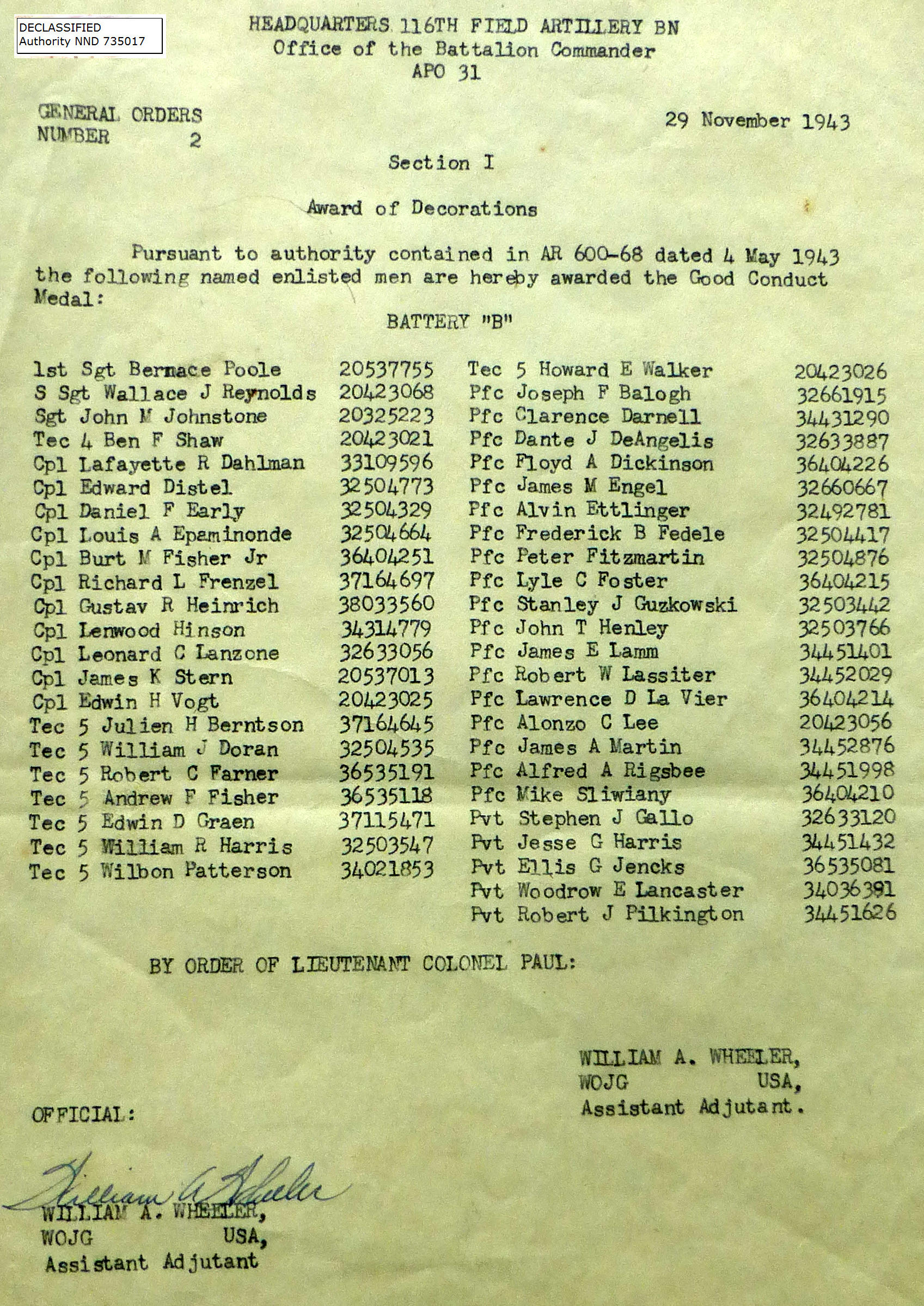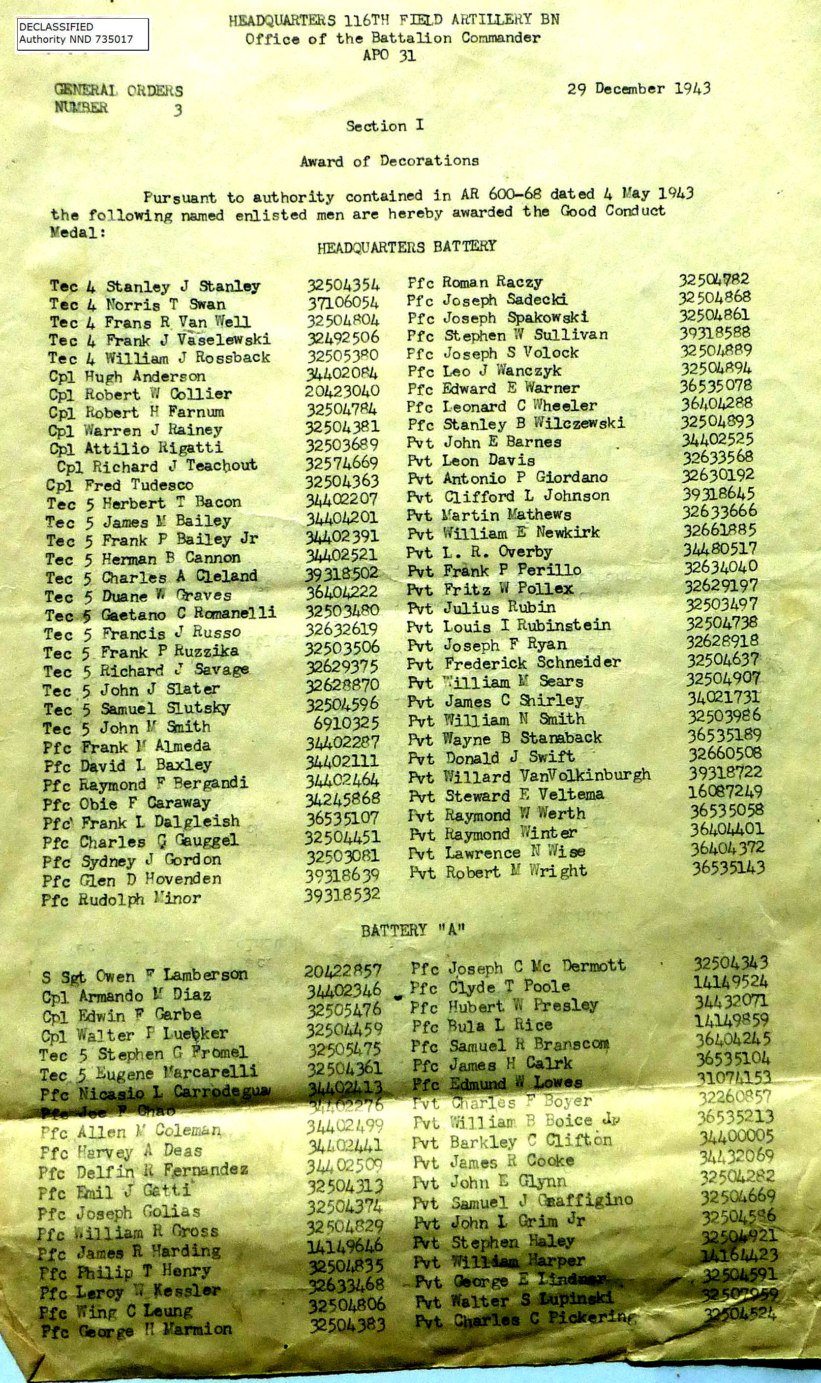 1943-002 | 11/29/1943 | Good Conduct Medals, B Batt |
