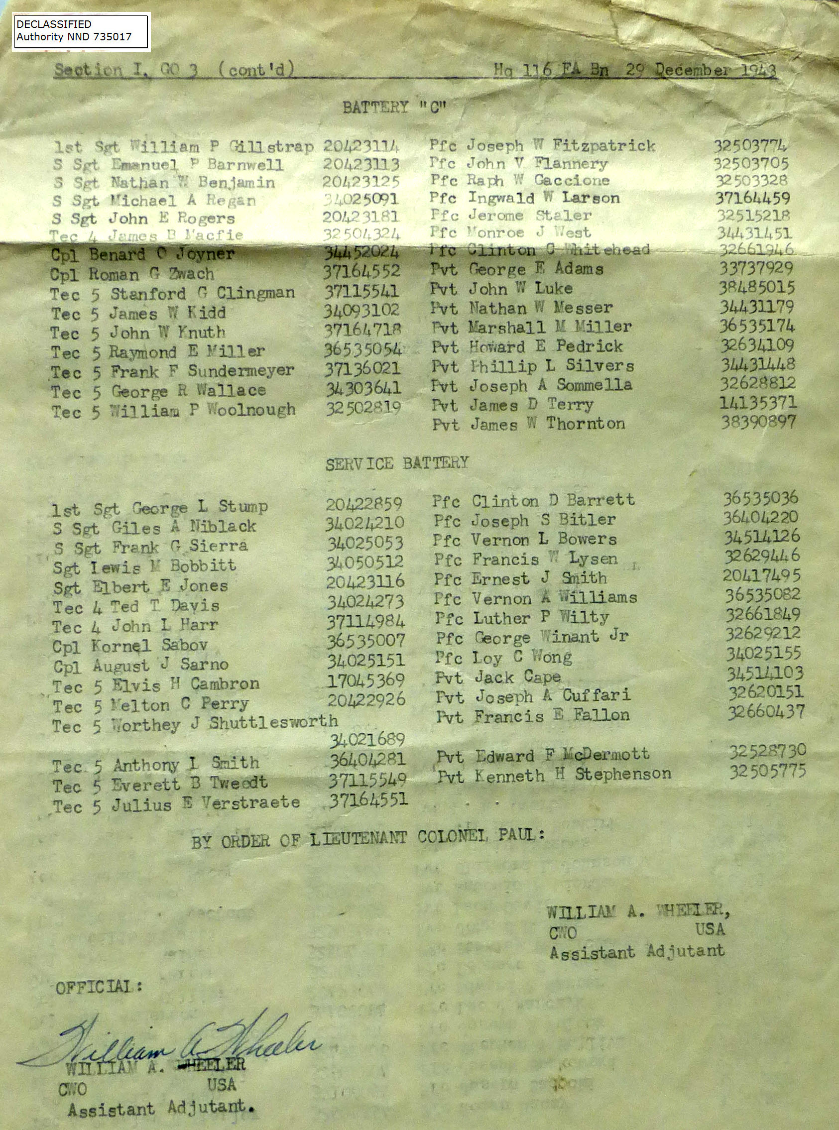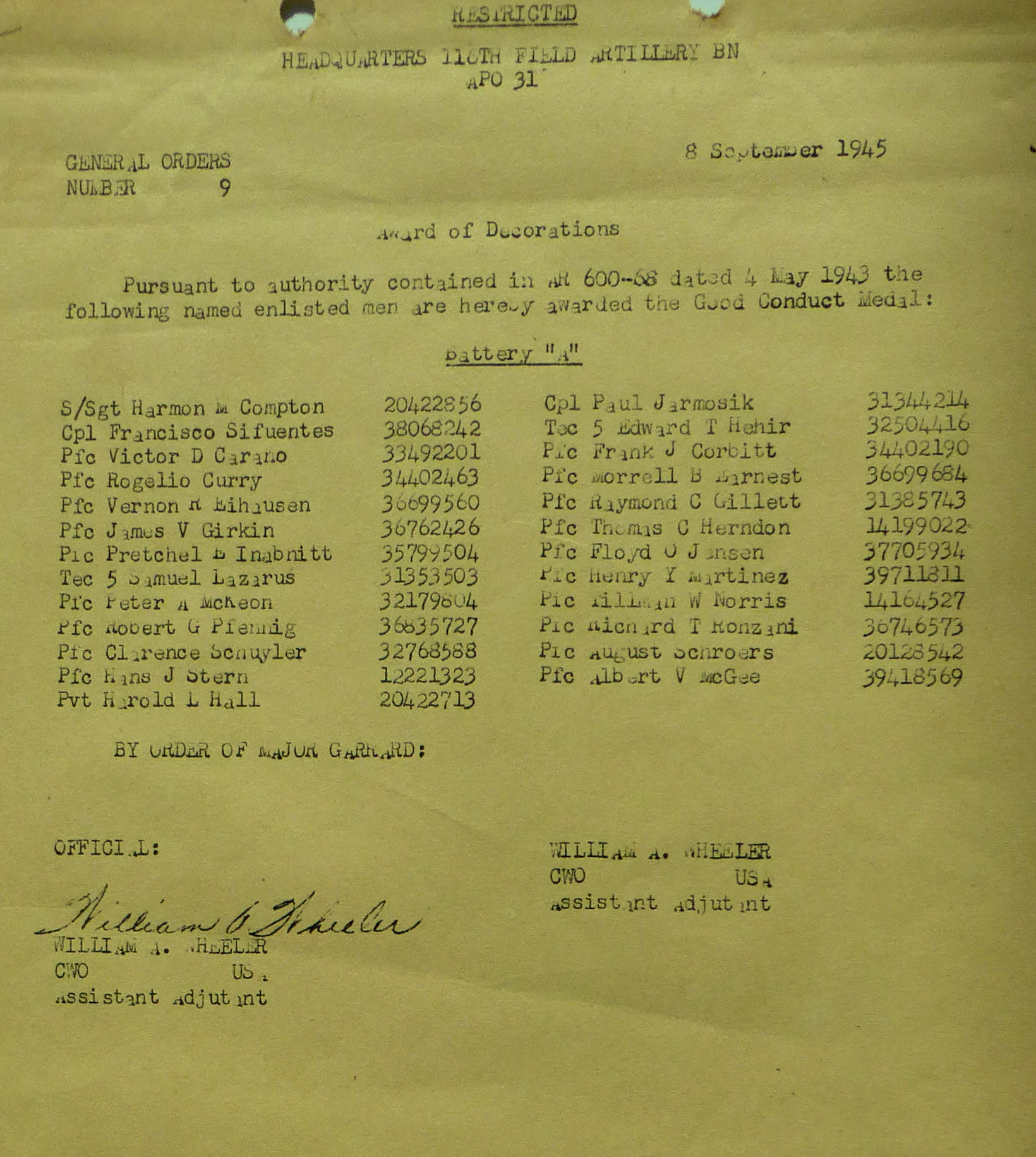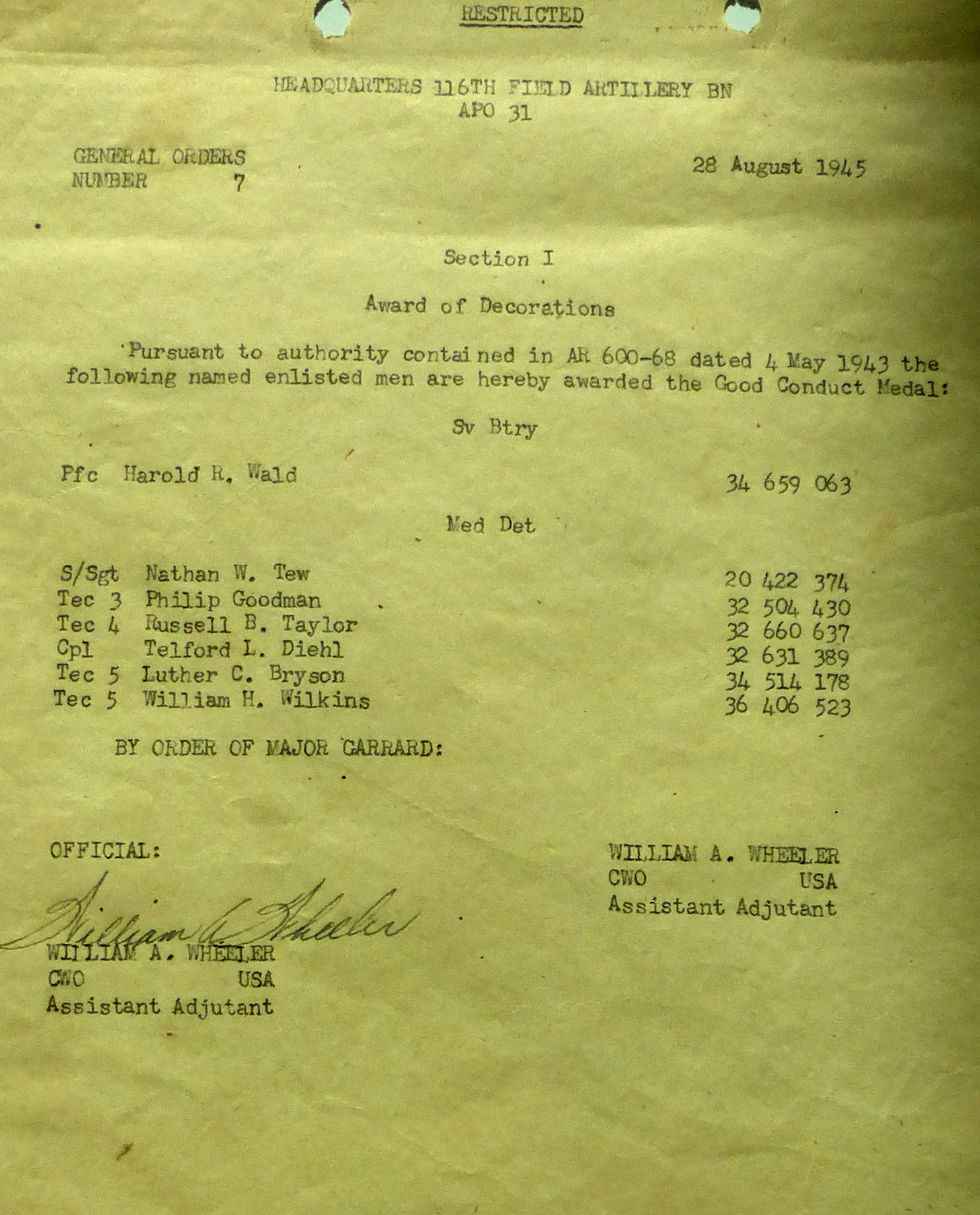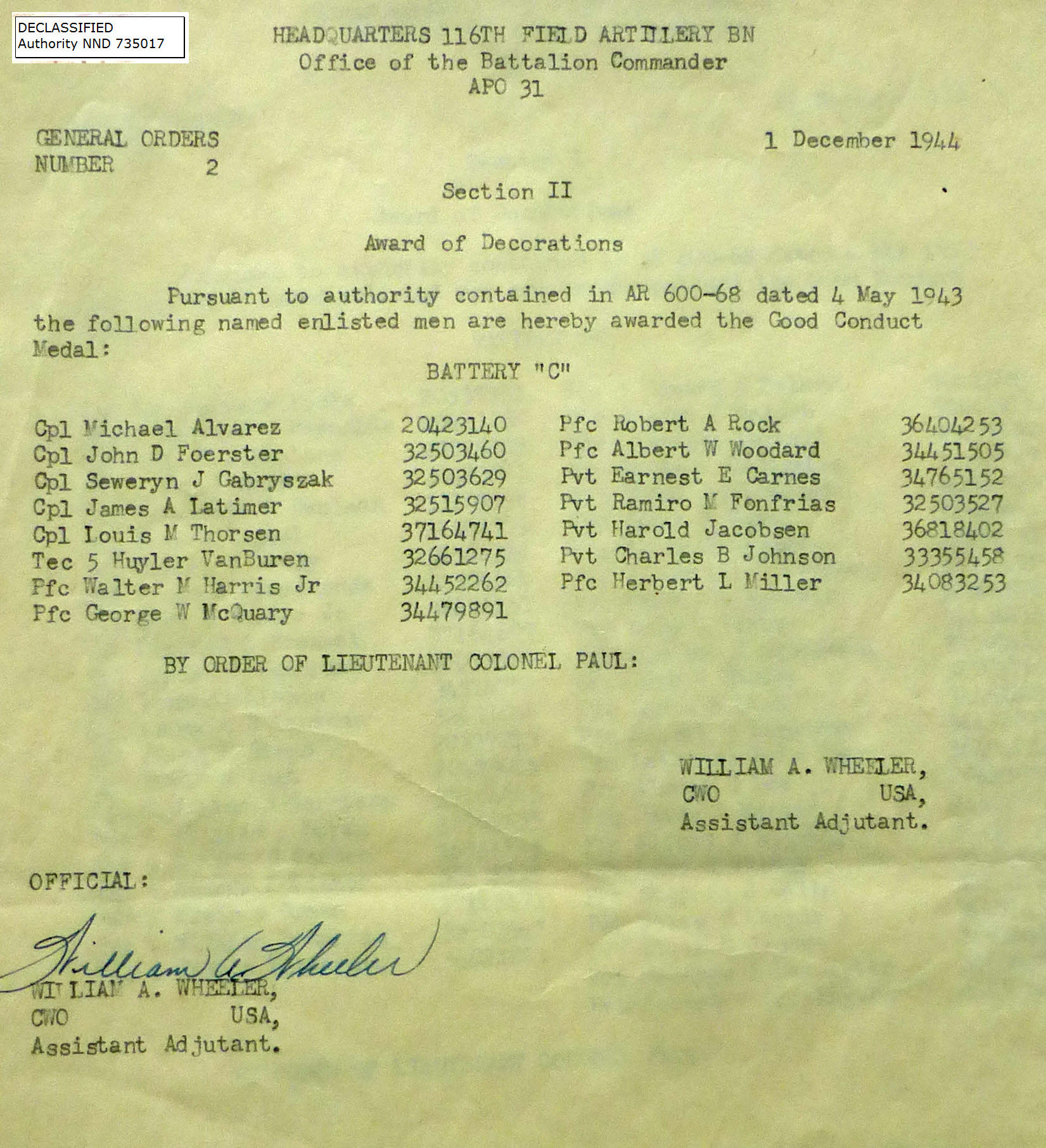1943-002 | 11/29/1943 | Good Conduct Medals, B Batt |