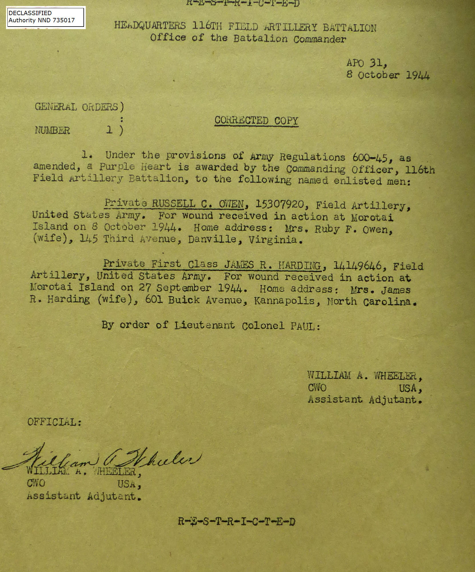 1944-001 | 10/08/1944 | Purple Heart to Russell Owen & James harding |