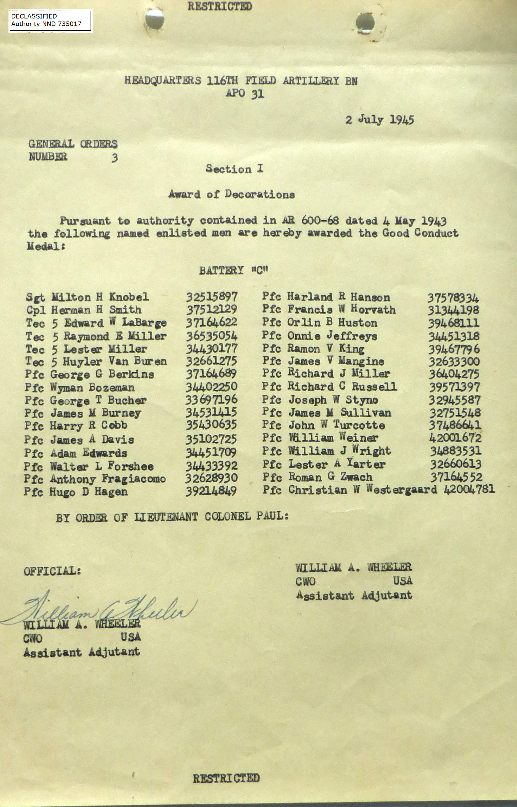 1945-003 | 07/02/1945 | Good Conduct Medals, C Batt |