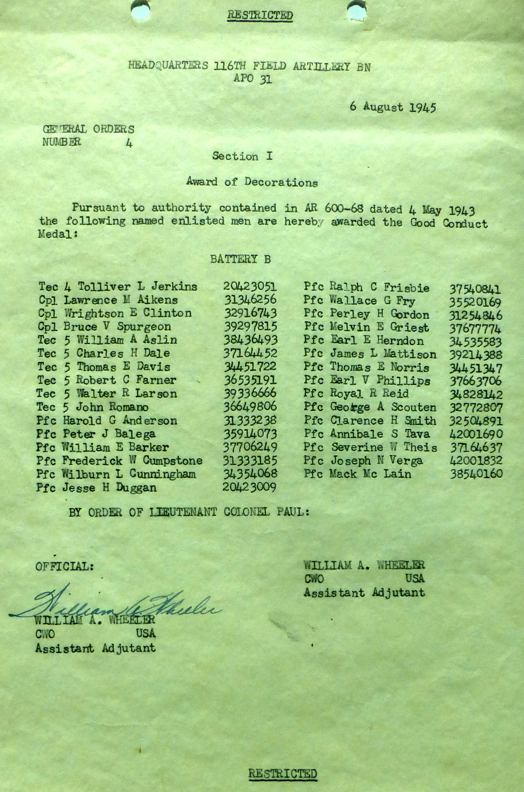 1945-004 | 08/06/1945 | Good Conduct Medals, B Batt |