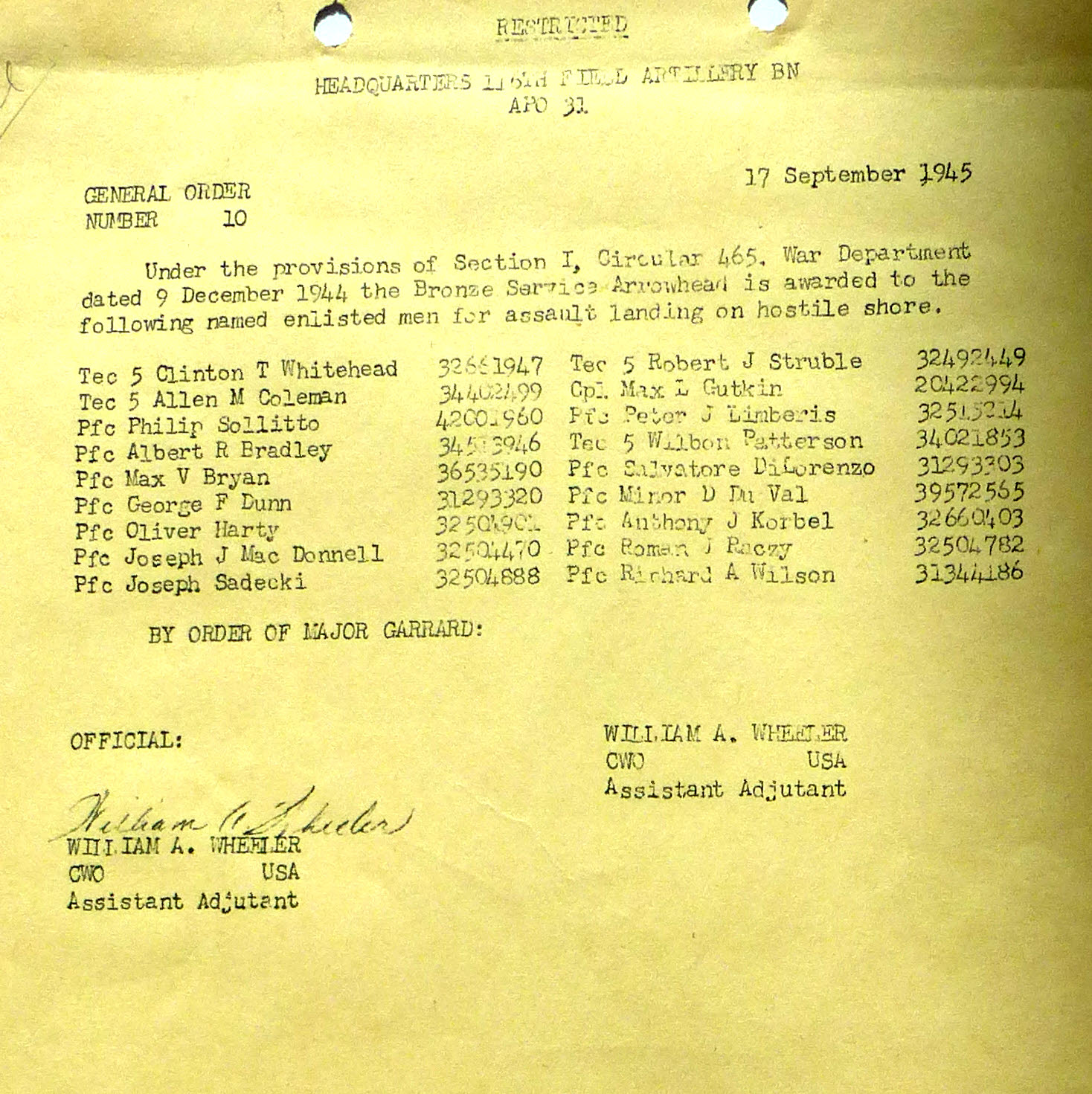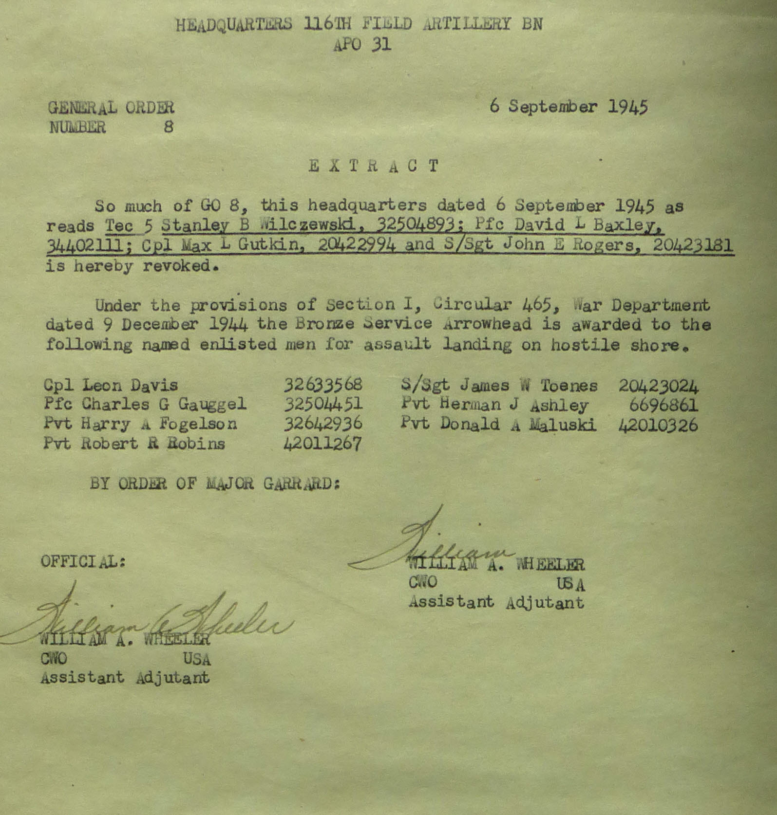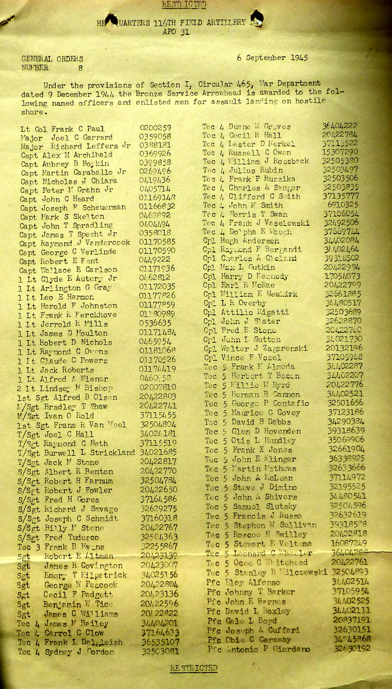 1945-010 | 09/17/1945 | Bronze Service Arrowheads for assault landing on hostile shore |