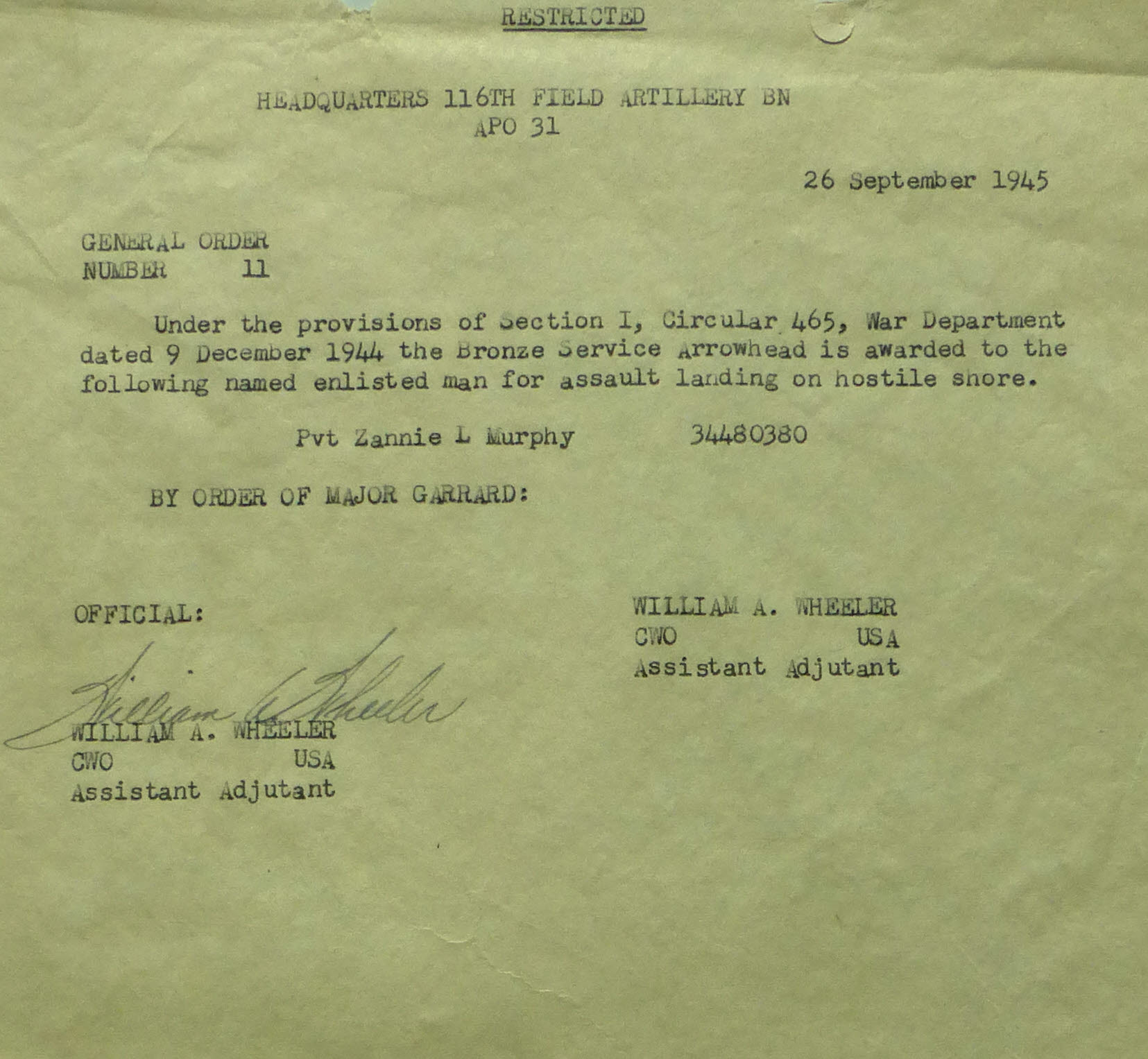 1945-011 | 09/26/1945 | Bronze Service Arrowhead for assault landing on hostile shore to Zannie Murphy |