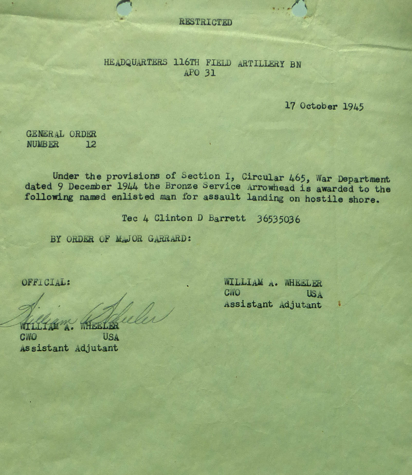 1945-012 | 10/17/1945 | Bronze Service Arrowhead for assault landing on hostile shore to Clinton Barrett |