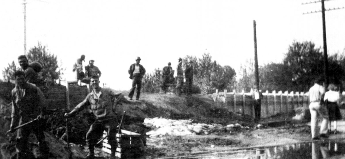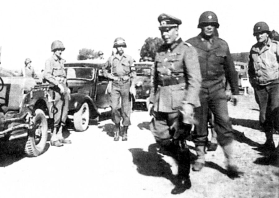 ![]() Surrendering German Major General Erick Elster in September 1944 after being ferried across the Loire River by the 308th Combat Engineer Bn prior to his official surrender. LTC Dodge is on far right. |