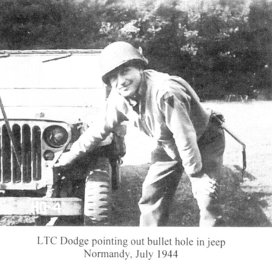 ![]() LTC Dodge pointing out bullet holes in his jeep in Normandy, July 1944. The 308th Engineer Bn landed in Normandy, 19 June 1944 and fought through 5 campaigns as part of General Patton's 3rd Army. They established the successful bridgehead across the Elbe River that opened the path to Berlin and the link-up with the Russins. |