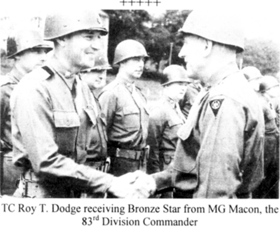![]() LTC Roy Dodge receiving Bronze Star from MD Macon, 83rd Division Commander. |