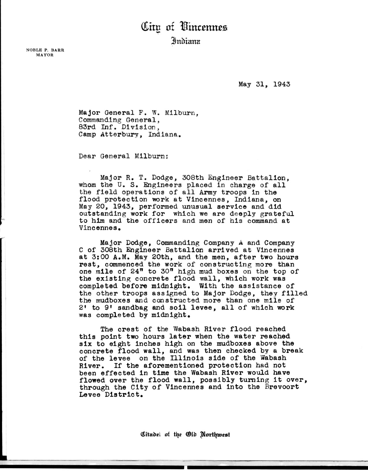 ![]() Letter from the Vincennes, Indiana Chamber of Commerce to Major Dodge, 10 June 1943 |
