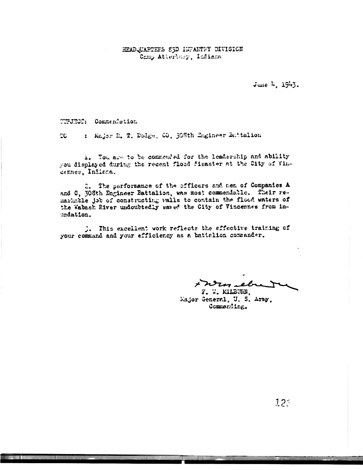 ![]() Commendation from MG Milburn to Major Dodge, Camp Atterbury, Indiana, 04 June 1943 |