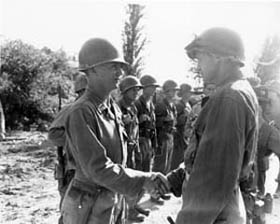 Major General Hobart R. Gay, CG, 1st Cavalry Division, (Korean War) congratulates 2nd Lieutenant Raymond A. Whelan of Mossap, Conn., after awarding him the Silver Star for meritorious services. General Gay was in the automobile with General George Patton when the accident occurred that eventually caused General Patton's death. |