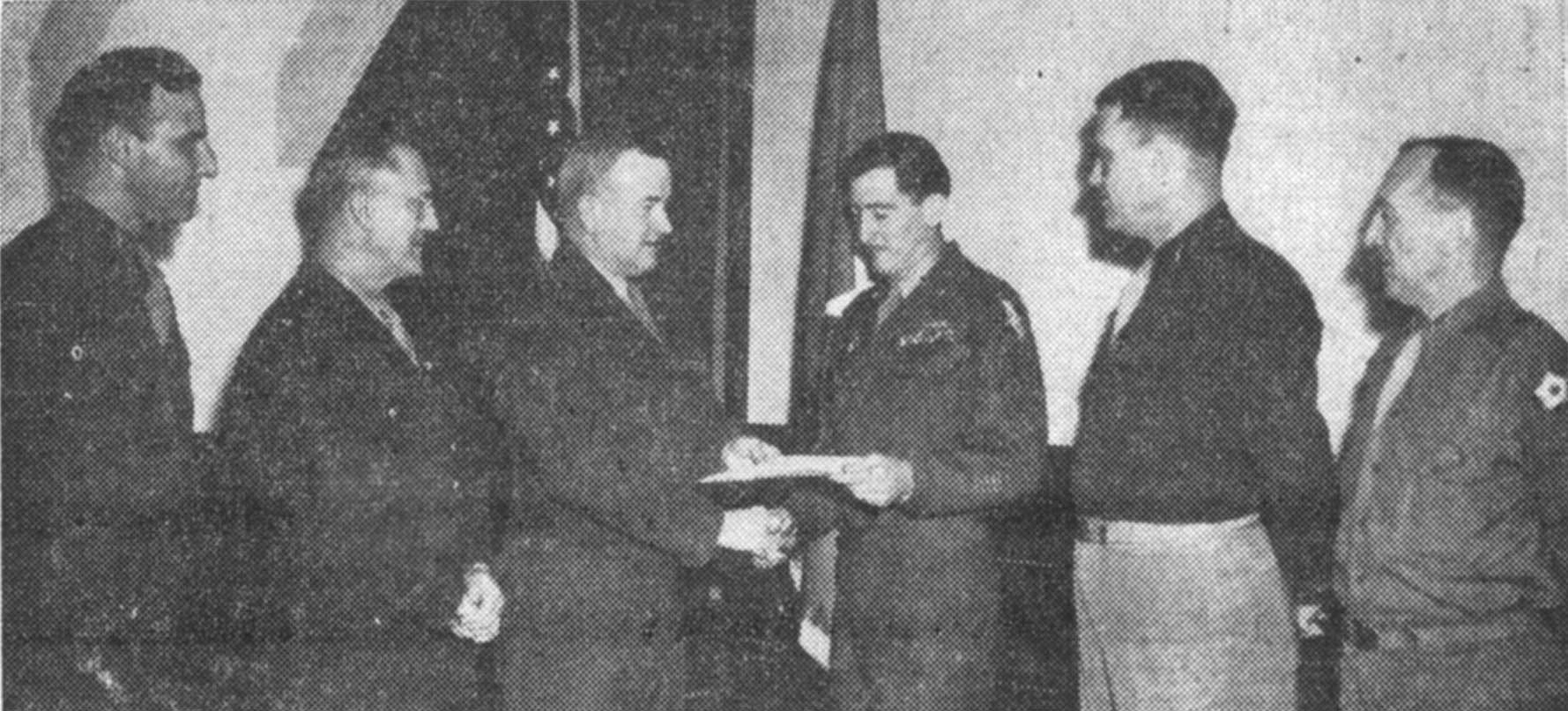 The 250,000th man to be discharged at the Separation Center here was presented his discharge certificate by Brig. Gen. Ernest A. Bixby, Post Commanding General in a ceremony early Tuesday morning. The quarter millionth man was Pfc. Cosier F. Nowosielski, twice wounded Detroit veteran. Present for the occasion were, left to right: Col. Chester F. Allen, Commanding Officer of the Separation Center; Col. Thomas L. Martin. Executive Officer, War Department Personnel Center; Gen. Bixby; Pfc. Nowosielski; Col. John E. Brannan, Post Executive Officer; and Lt. Col. Donovan McGee, Assistant Executive Officer, Personnel Center. The 250,000th Man discharged from the Separation Center here since it's activation was presented his certificate early Tuesday morning by Brig. Gen. Ernest A. Bixby, Commanding General of Camp Atterbury. The quarter-millionth man was