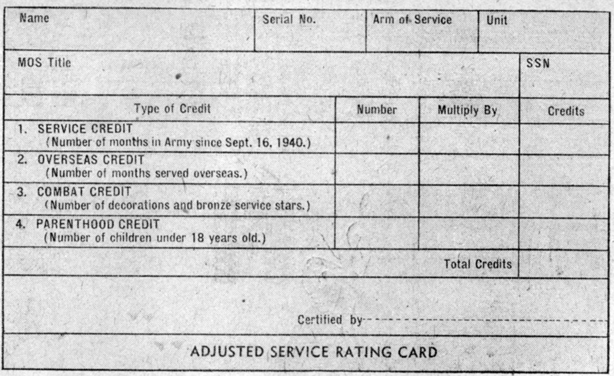 12 May 1945 ATTERBURY RELEASES FIRST VETS UNDER "CREDIT" PLAN Approximately Three Hundred Overseas Veterans Receive Discharges Saturday The Army's point system for discharging personnel went into immediate operation at the Atterbury Separation Center this morning and today approximately 300 soldiers who have 85 or more points under the adjusted service rating plan will be returned to civilian life. The discharges are all overseas veterans who were attached lo the Rexeption Station here awaiting call from the port to return to their overseas organizations. The point system, which was announced by the War Department Thursday. is now in full operation. Special clerks went to work at the Reception Station where overseas returnees report for furloughs and tempoary duty in the States, compiling the various service credits. Of the first group of 34 put on orders for separation under the point system, 21 were from Ohio, 7 from Kentucky and 6 from Indiana. Operation Is Described The Separation Center receives the men from the Reception Station and started processing immediately so that they could be discharged today. May 12th. the date set by the Army for the operation of the point system. The center has been geared for this demobilization and with 48 hours the GIs change their military ranks for the title of "mister." The discharge procedure went into operation soon after the veterans arrived. First. their service records are turned over to a battery of clerks for final checking. While this is going on, the separatees listen to an orientation talk on separation procedure. Given Physical Exam The GIs then experience the same thorough physical examination as when they were first inducted into the Army. Next comes the counseling service where the men are interviewed and a summary of their military history recorded. The counselors also give data on government insurance, the GI Bill and other matters. Services of the Veterans Administration and the United States Employment Service are available through their representatives. Now the men near the end of processing. The returnees report to the supply warehouse where they turn in all their equipment and clothing except that which they will be allowed to take home. While at the warehouse the GI receives the new discharge patch, which is sewed just above the right pocket of his shirt or blouse. Gel Travel Allowance The turning in of the clothing marks the last step before the end of the soldiers' Army careers. The men return to the Records Section to sign the payroll, and then are taken to the Finance Office where they receive their final Army pay, the first installment of mustering out pay. and travel allowance of five cents a miles to the location of their home draft boards. They are then given their discharges and buttons for civilian coat. |