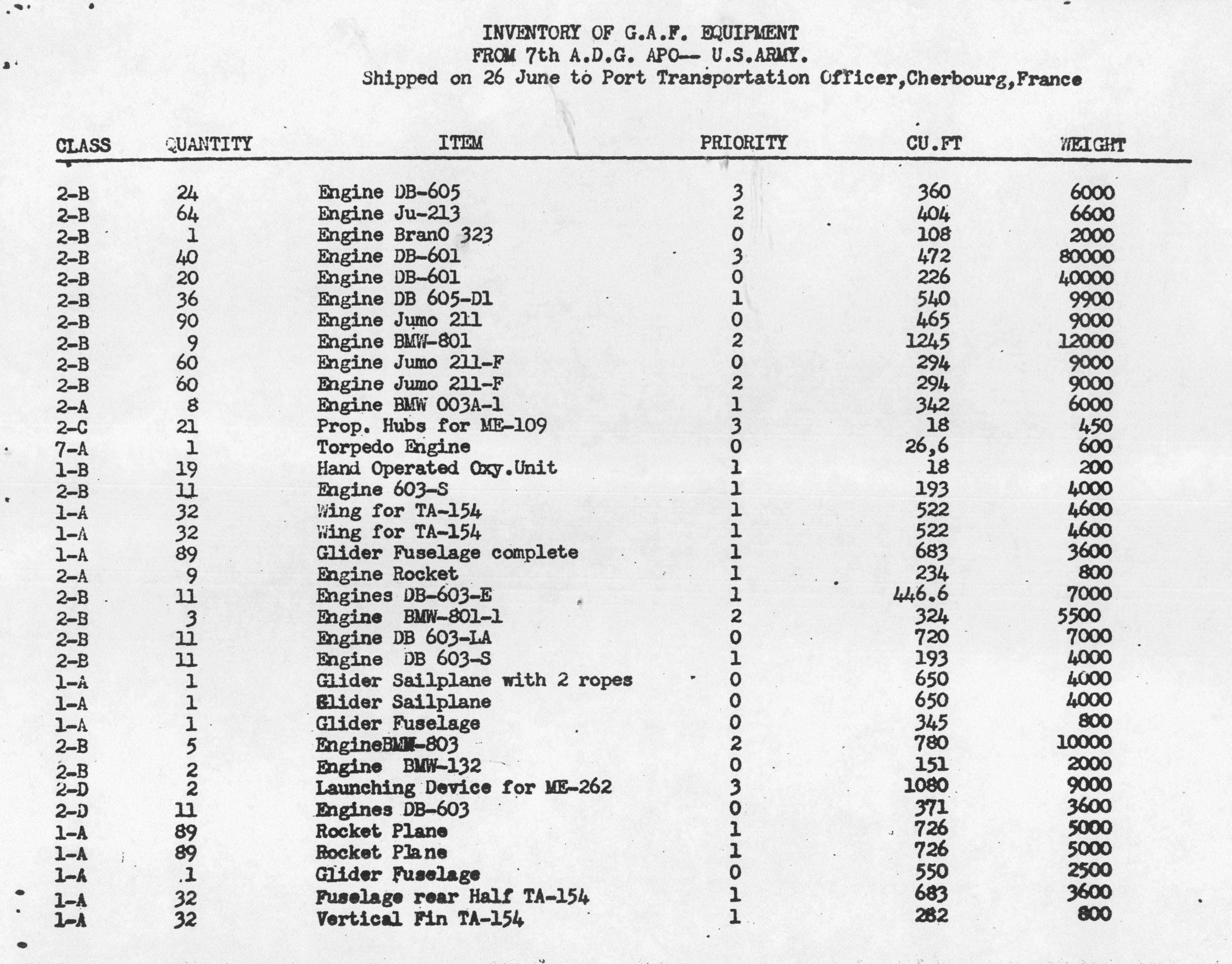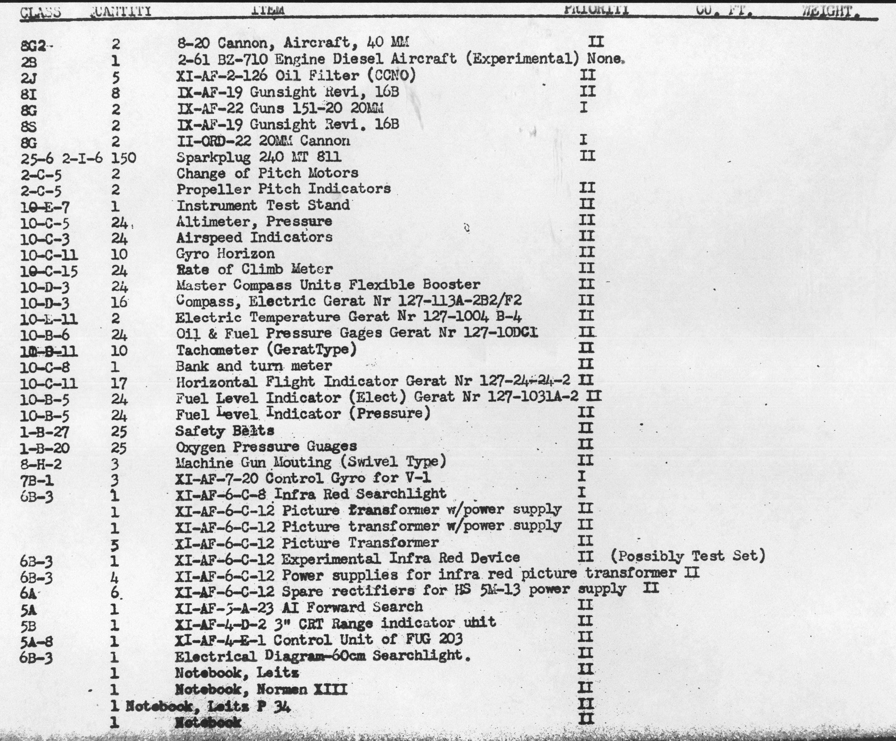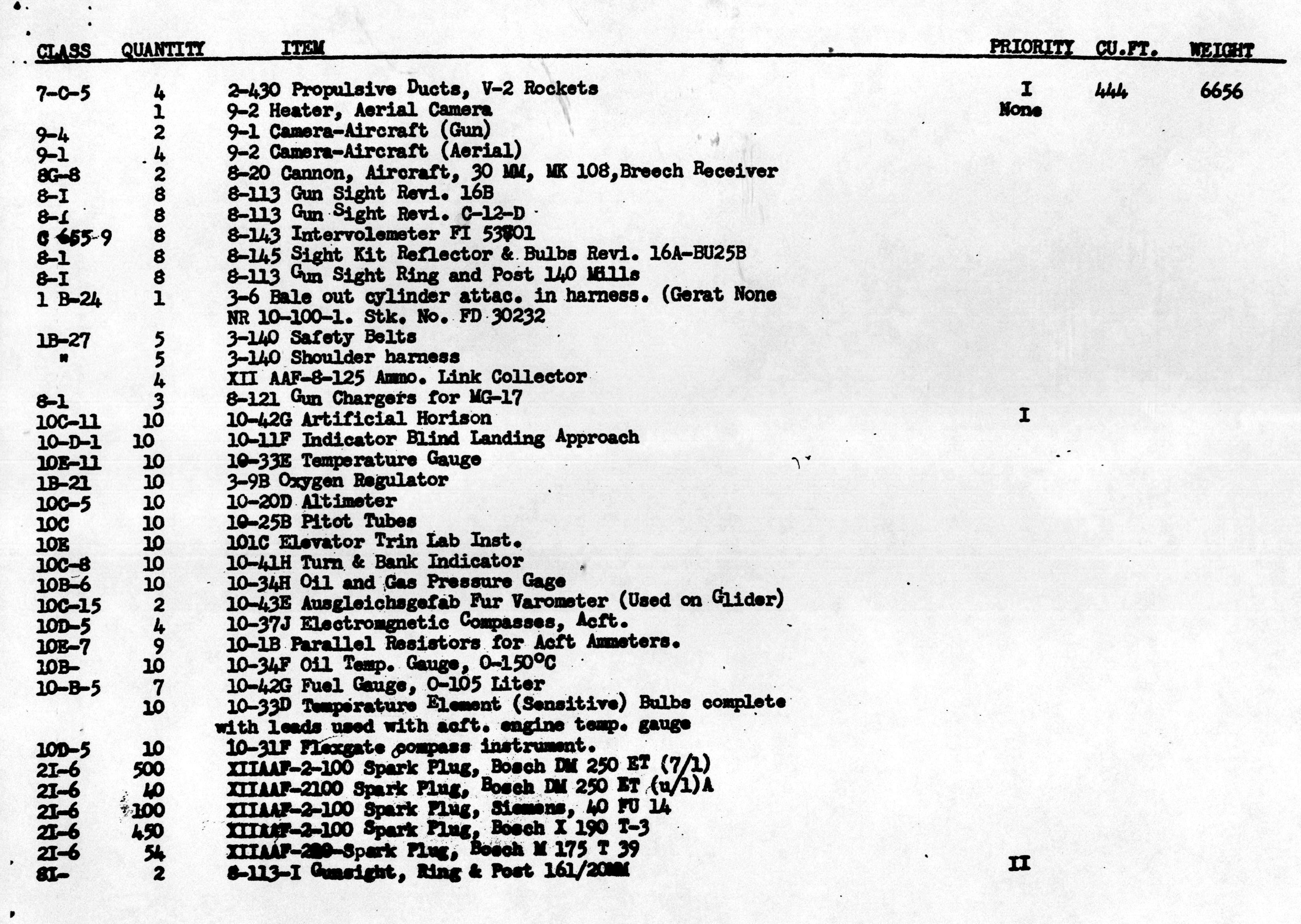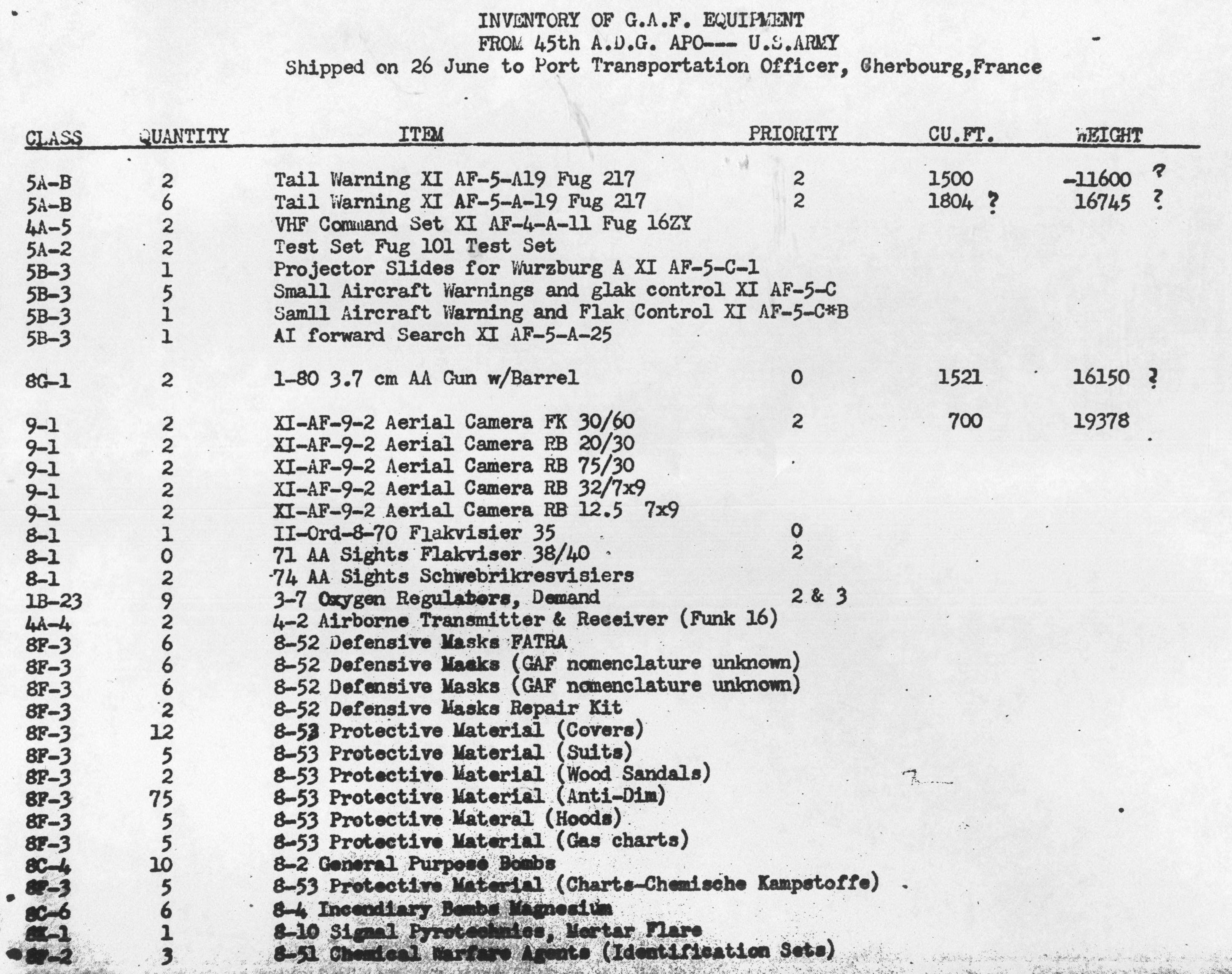 Inventory List of German Military Items Loaded Aboard the Liberty Ship Richard J. Gatling.