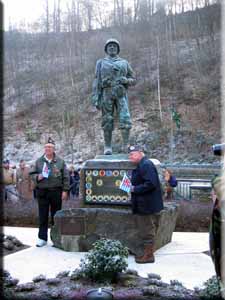 Camille Kohn, president of CEBA, French acronym for a Battle of the Bulge research organization, told the veterans the nation feels "immense gratitude" for the American soldiers who liberated it after five years of oppression. Kohn joined Clervaux Mayor Francis Stephany in laying flowers at the foot of the GI Monument during a solemn ceremony in the town center. The statue of a war-weary foot soldier was erected in the early 1980s to share the story of Clervaux's liberation with future generations, Kohn said. It represents "the immense gratitude we have borne in our hearts, carved into metal for all eternity," he told the veterans. In overcoming the Germans, Kohn said the Americans conquered more than an enemy force. "You conquered the hearts of an oppressed people," he said. "And we are deeply indebted to the United States for all that your gracious nation did for us." Stephany said his townspeople and countrymen have never forgotten the actions the U.S. military took six decades ago to free Luxembourg. He told the veterans — most now in their late 70s and 80s — that his nation remains grateful and "will never forgot those who paid the full price" of victory. It's important for the Luxembourgers to share this message with younger generations so they too will understand the cost of freedom and recognize that oppression can't be permitted to stand, Stephany said. It's a lesson as applicable today as 60 years ago, he said, particularly in light of the terrorist attacks on the United States on Sept. 11, 2001. "Now it's up to us to help sustain" the war against terrorism "so we can continue to live in freedom," he told the group. Veterans at the ceremony, many with family members at their sides, said it was gratifying to receive heartfelt thanks for their actions during what many called a turning point in their lives. "I went in and 18 and came out as an old man at 21," said former Army Spc. Carl Dalke, who served with the 101st Airborne Division in Bastogne, Belgium, during the Battle of the Bulge. Dalke acknowledged that he and his fellow soldiers endured "gut-wrenching experiences" as they faced brutal weather conditions and limited food supplies while facing off against a massive German force. He still tears up as he remembers losing his best friend during the first week of the war, and called his visit to the 60th anniversary commemoration a fitting way to remember him and other 19,000 U.S. troops who died here. Despite the heartaches associated with the war, Dalke said he "came away with a love" of the local people for helping him and other soldiers. He remembers with fondness the local people sharing food with the hungry troops, and taking their sheets off their beds so the soldiers could use them as camouflage against the snow. Former Army Sgt. Pat Murphy was 18 when he served with the 78th Infantry Division during the Battle of the Bulge and admits that he "didn't think I'd live to see 19." Now 78, Murphy said he felt it important to attend the commemoration as the number of World War II veterans dwindles. "Let's face it," he said with tears forming in his eyes, "this is probably our last big anniversary." He said the visit is a way for him to remember the past "and to pay respect for all my buddies who were killed or badly wounded." Murphy considers himself "extremely lucky": 87 percent of his division was killed or wounded during the war. Gus Swiersz, a staff sergeant with the 28th Infantry Division during the Battle of the Bulge, said the visit to the 60th anniversary commemoration was "much more emotional to me" than previous return visits to the region. This time, he brought along his son and his 11-year-old grandson, Matthew, so they could relive with him his experiences as a squad leader who encountered what he believes were the opening shots of the campaign. "We have three generations here," Swiersz said. "We're all experiencing this together." (By Donna Miles, American Forces Press Service) December 16, 2004 - Belgium honors Bulge vets Bastogne, Belgium, Dec. 16 (UPI) -- There are not many places in Europe where the Stars and Stripes flutters from public buildings, where locals express their "Thanks to the Yanks" and where Americans are revered as saviors -- but the Belgian town of Bastogne is one of them. If my children are free it is thanks to you," local resident Pascale Hane tells Ahren Jacobson, an 83-year old veteran in town for the 60th anniversary of the "Battle of the Bulge," Nazi Germany's last, desperate throw of the dice on the western front. "You are incredible. I can't believe what you did back then. You are real heroes." The feeling is shared by many other Belgians in this Ardennes town that saw some of the fiercest and bloodiest fighting in World War II. "Bastogne says to you: thank you very much," reads a sign in one shop window. In the visitors' book of the Bastogne Historical Center, one local has written in French: "I have a great admiration for every one of the soldiers who came from so far to liberate us from the Germans." Another says simply: "We will never forget you." The people of Bastogne and Belgium have every reason to feel grateful to the United States. On Dec. 16, 1944, the German army launched its last major counter-offensive of the war when a quarter of a million troops poured through a lightly defended gap in the Allied defenses. The Nazis' aim was to quickly take the lightly defended towns of the Ardennes Forest, seize the strategically important supply port of Antwerp, and drive a wedge between Allied forces in the Netherlands and northern France. What the Wehrmacht did not count on was the U.S. Army's refusal to buckle under enormous pressure. Outnumbered by a ratio of three to one, badly equipped and often untested in combat, the soldiers of the 80,000-strong American Eighth Army Corps were completely taken by surprise in the early hours of Dec. 16. James Manning, an 85-year old veteran of the North African and Sicilian campaigns, w