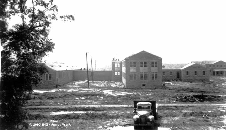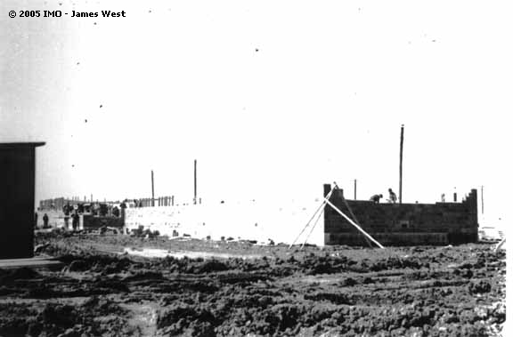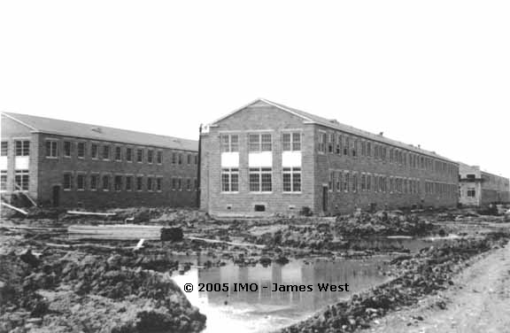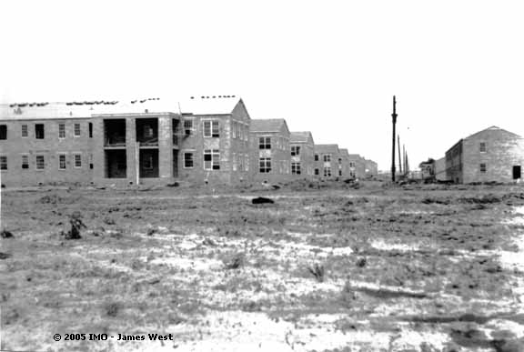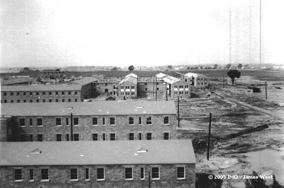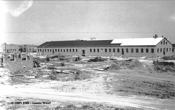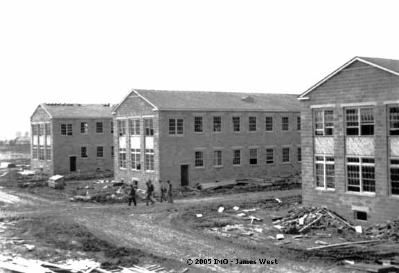 ![]() 26 Nurses' Mess Hall (bldg. 1001 and 1002 behind it.) and dormitories with future Headquarters building in the center. Hospital Road. Cement mixing plant across the road. |