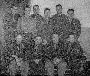Seated l-r: Capt. William Morgan, Chief, Out Patients Clinic; 1st Lt. George Kurland, Asst. Chief, Medical Service; Col. Young; Major Elmer Capellari, Chief, N-P Section (See below). Standing: Capt. Thurwald Anderson, Chief, Allergy