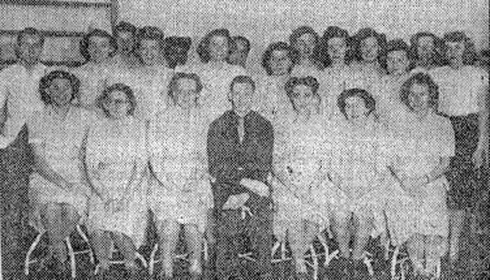 First Row, l-r: 2nd Lt. Aileen Lasse, Physical Therapist; 2nd Lt. Virginia Smith, Physical Therapist; 1st Lt. Hazelle Erickson, Physical Therapist; Captain William S. Haeckler, Medical Director of Physical Therapy; Captain Catherine Wallace, Chief Physical Therapist; 1st Lt. Rhea Disney, Physical Therapist; 2nd Lt. Leah Crawford, Physical Therapist. Second Row, l-r: Donald McFarland, Janitor, 1st Lt. Agnes Faggart, Physical Therapist, 2nd Lt. Doris Slack, Physical Therapist, 2nd Lt. Kathryn Shaffer, Physical Therapist; 1st Lt. Adeline Watson, Physical Therapist; 2nd Lt. Mary Driscoll, Physical Therapist; 1st Lt. Anne Hastings, Physical Therapist; Sarah Guice, Secretary. |